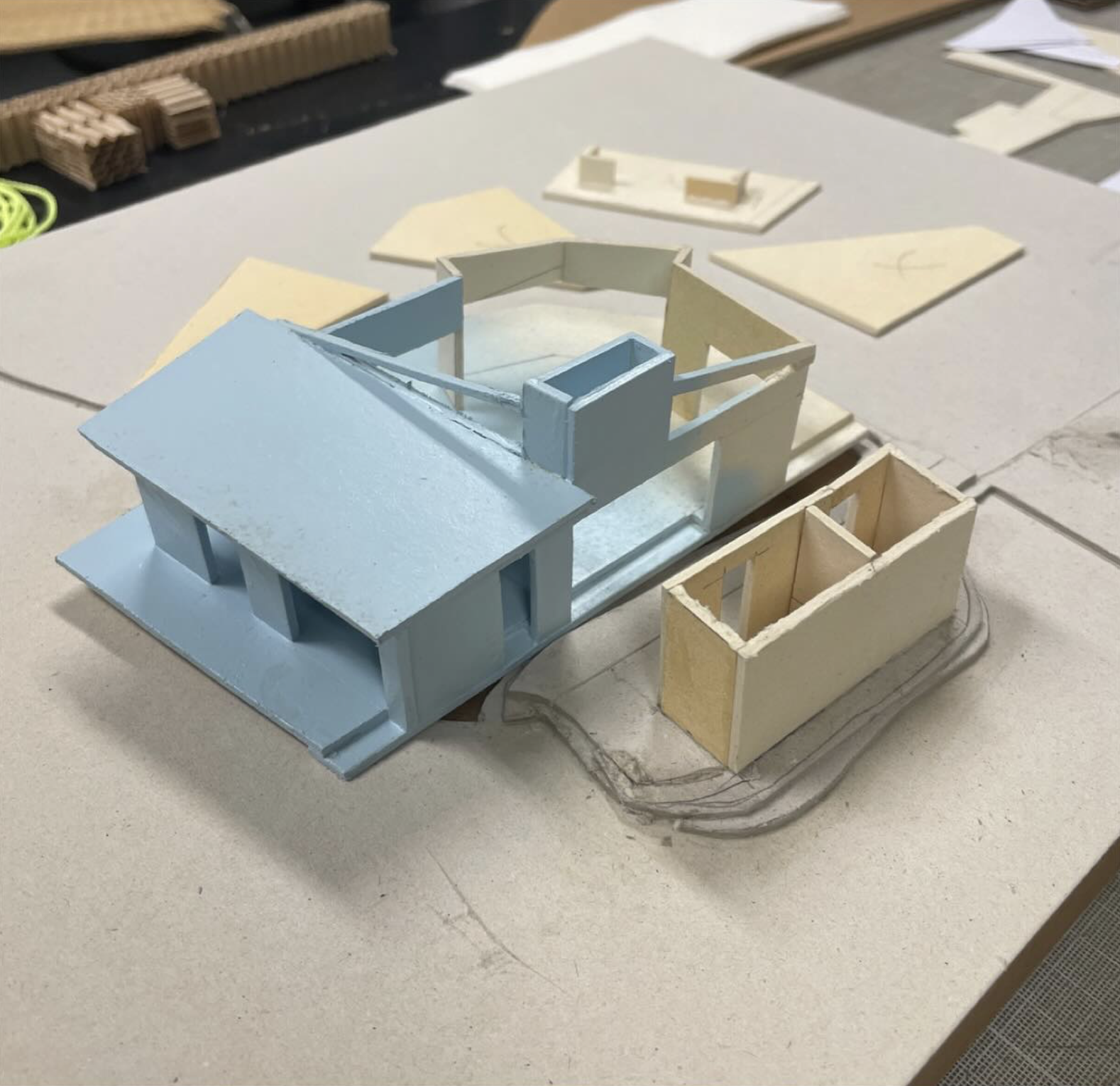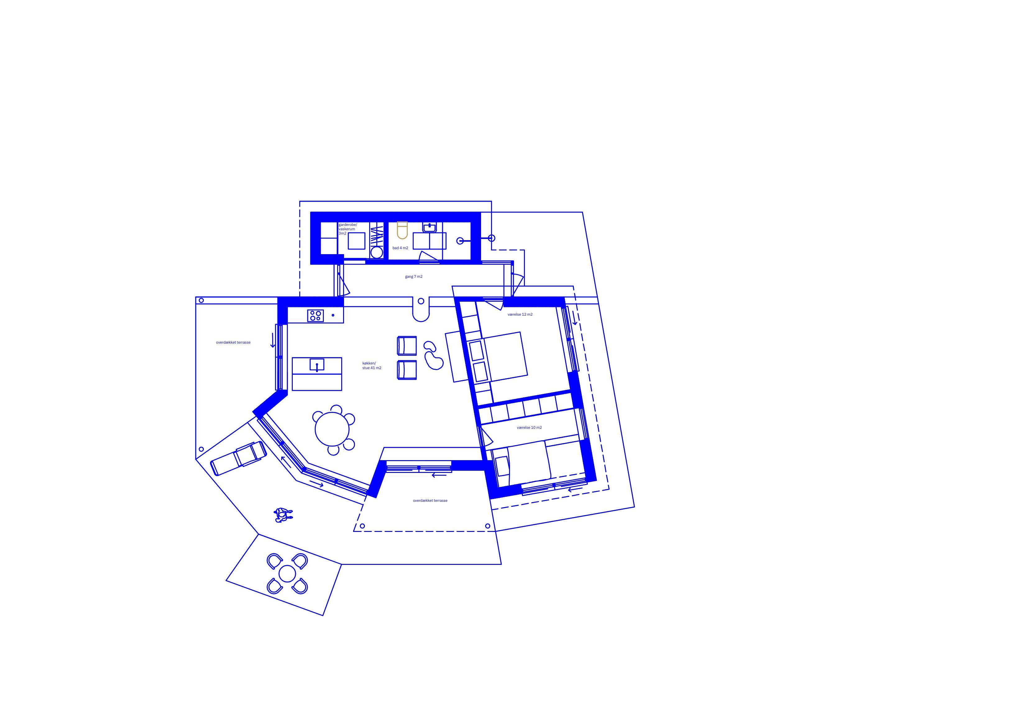 Κάθε λειτουργία στεγάζεται σε ανεξάρτητο καθ'ύψος όγκο. Η εσωτερική κυκλοφορία ακολουθεί κυκλική ροή. Οι γραμμές όρασης κινούνται ελεύθερα στην κάτοψη, καθοδηγούμενες από ανοίγματα και πλαίσια που έχουν τοποθετηθεί με ακρίβεια. Μια ξυλόσομπα σηματοδοτεί το κέντρο, προσφέροντας θερμότητα και οπτική ηρεμία.