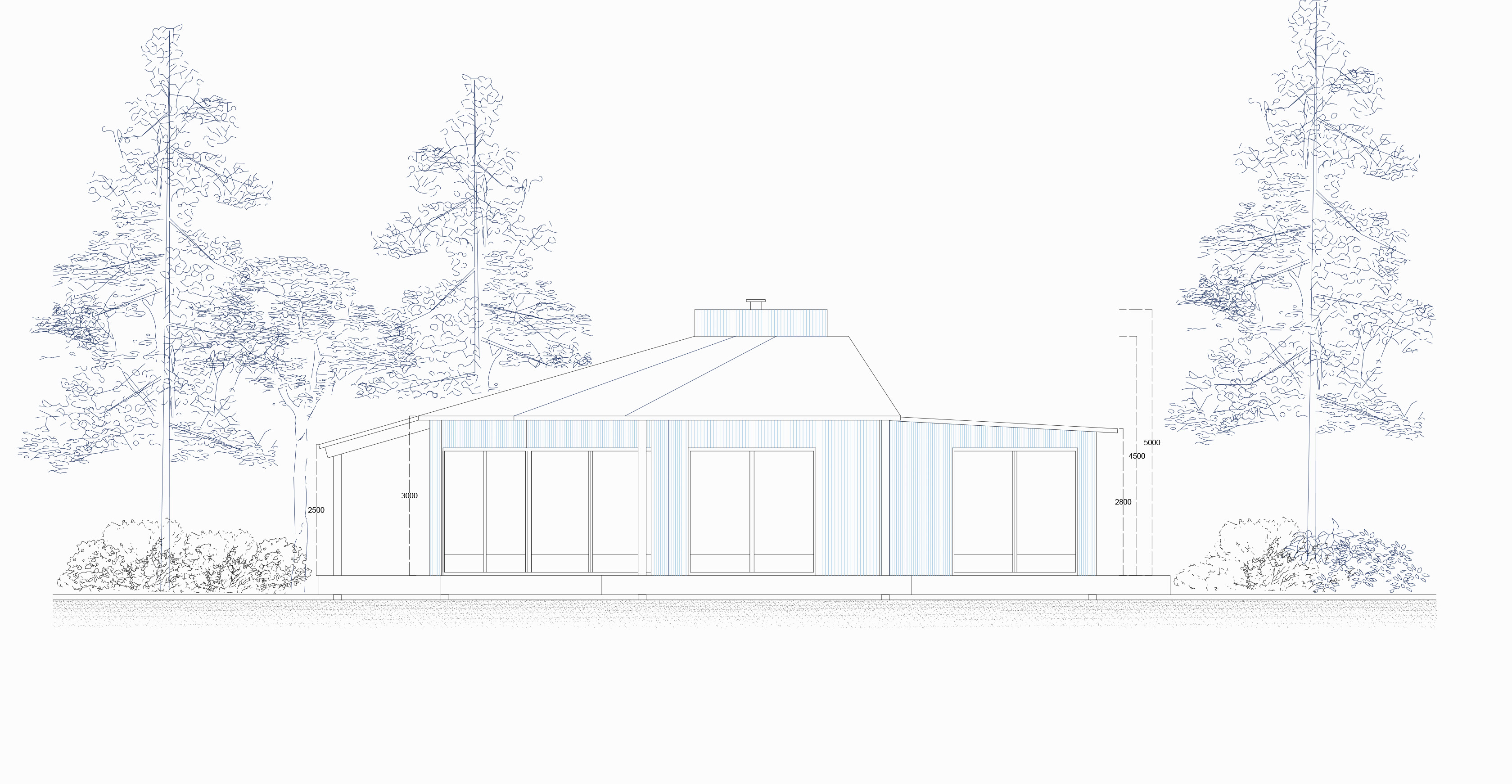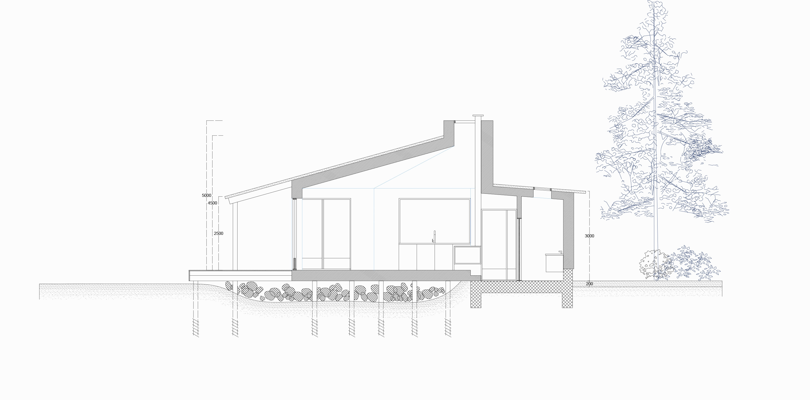 Το σπίτι υψώνεται ελαφρά πάνω από το έδαφος. Η ξύλινη κατασκευή του συναντά το τοπίο με ήπια επαφή. Μεγάλα ανοίγματα διευρύνουν το οπτικό πεδίο. Μια συνεχόμενη πλατφόρμα θολώνει τα όρια μεταξύ εσωτερικού και εξωτερικού, αφήνοντας τις εποχές να διαμορφώσουν την καθημερινότητα.