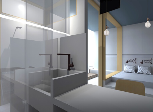 Το δωμάτιο λειτουργεί ταυτόχρονα ως προορισμός και ως αφετηρία· ένας χώρος για ανάπαυση αλλά και ενεργοποίηση. Στην κάτοψη και στην όψη, στοιχεία του ελληνικού τοπίου—φυσικού και ανθρωπογενούς—εμφανίζονται σε μικρογραφία, δημιουργώντας ένα σύνολο με ισχυρή ταυτότητα.