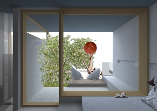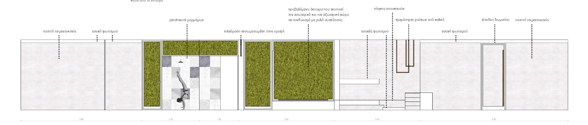 Η γλυπτική απλότητα χαρακτηρίζει την υλοποίηση των όγκων, με ιδιαίτερη έμφαση στον υπαίθριο και ημιυπαίθριο χώρο, ο οποίος αποκτά ίσο βάρος με το εσωτερικό. Οι οπτικές φυγές, οι διαμπερείς σχέσεις, η φύτευση και τα φίλτρα φωτός μέσω διαχωριστικών από γυαλί ενισχύουν την εμπειρία της ενότητας μέσα από τη διαφοροποίηση.
