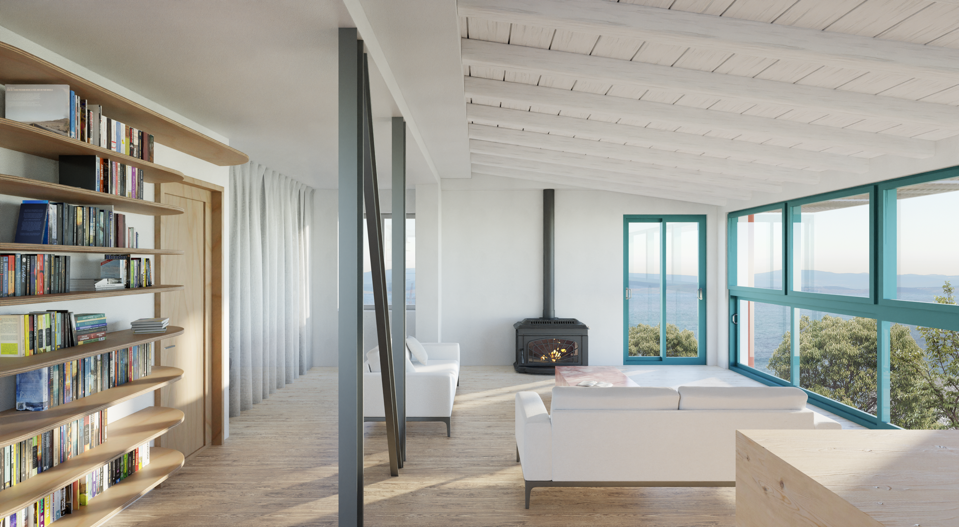 Το ισόγειο αναδιατάχθηκε. Δημιουργήθηκε κοινός χώρος βιβλιοθήκης και χώρος για ηλεκτρονικό παιχνίδι, προσαρμοσμένος στις ανάγκες των εφήβων. Στον επάνω όροφο, οι εσωτερικοί τοίχοι απομακρύνθηκαν. Ο ενιαίος χώρος καθιστικού προσανατολίστηκε προς τη θάλασσα. Η κουζίνα μετακινήθηκε, με στόχο την απελευθέρωση του οπτικού πεδίου και την ενίσχυση της κυκλοφορίας. Η τραπεζαρία οργανώθηκε ώστε να λειτουργεί ως σταθερό σημείο μέσα στον χώρο.