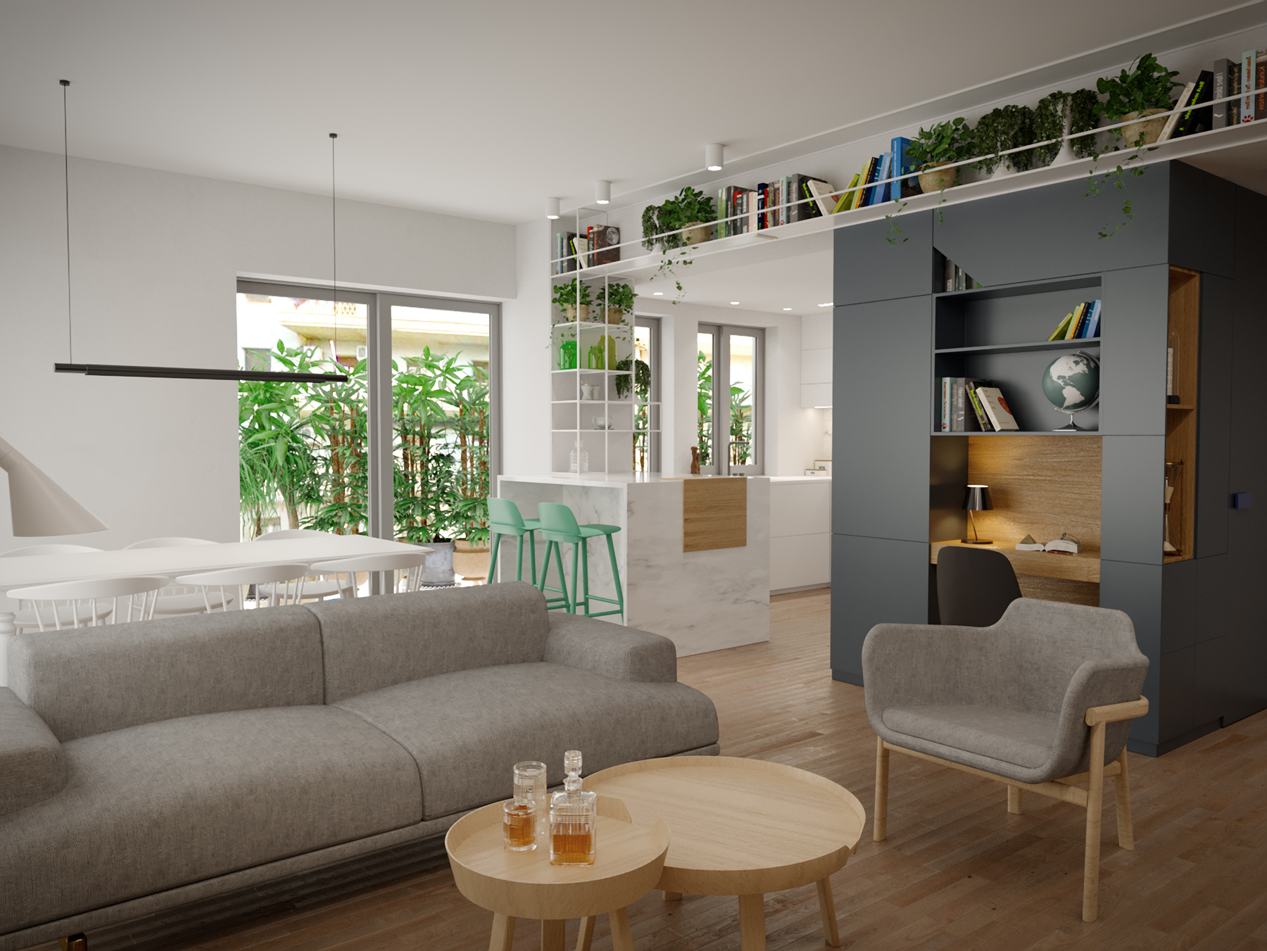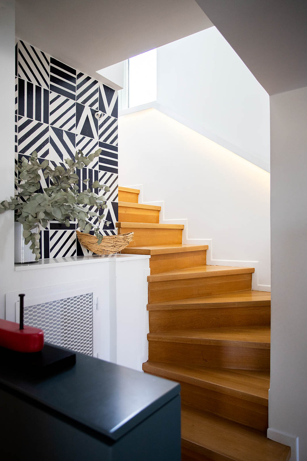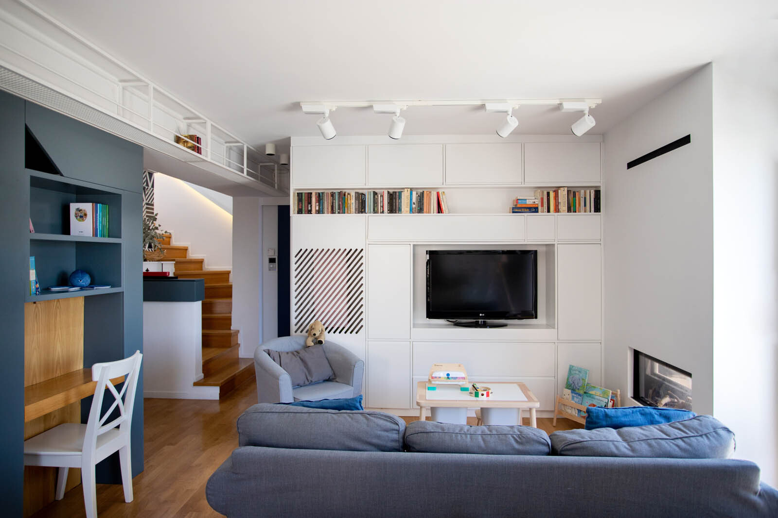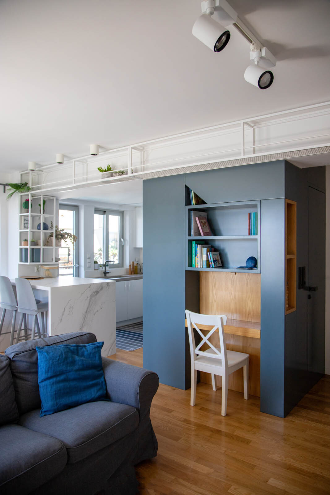 Η αρχιτεκτονική επέμβαση βασίστηκε στη συμπύκνωση. Δημιουργήθηκαν κατασκευές πολλαπλών χρήσεων: βιβλιοθήκη, γραφείο, τραπεζαρία, πάγκος μπαρ και αποθηκευτικοί όγκοι οργανώνονται σε ένα ενιαίο σύστημα που επιτρέπει την απρόσκοπτη κίνηση. Ο όγκος του WC μετατράπηκε σε σημείο αναφοράς. Η εσωτερική γεωμετρία φωτίζεται και καθοδηγείται από το βλέμμα.