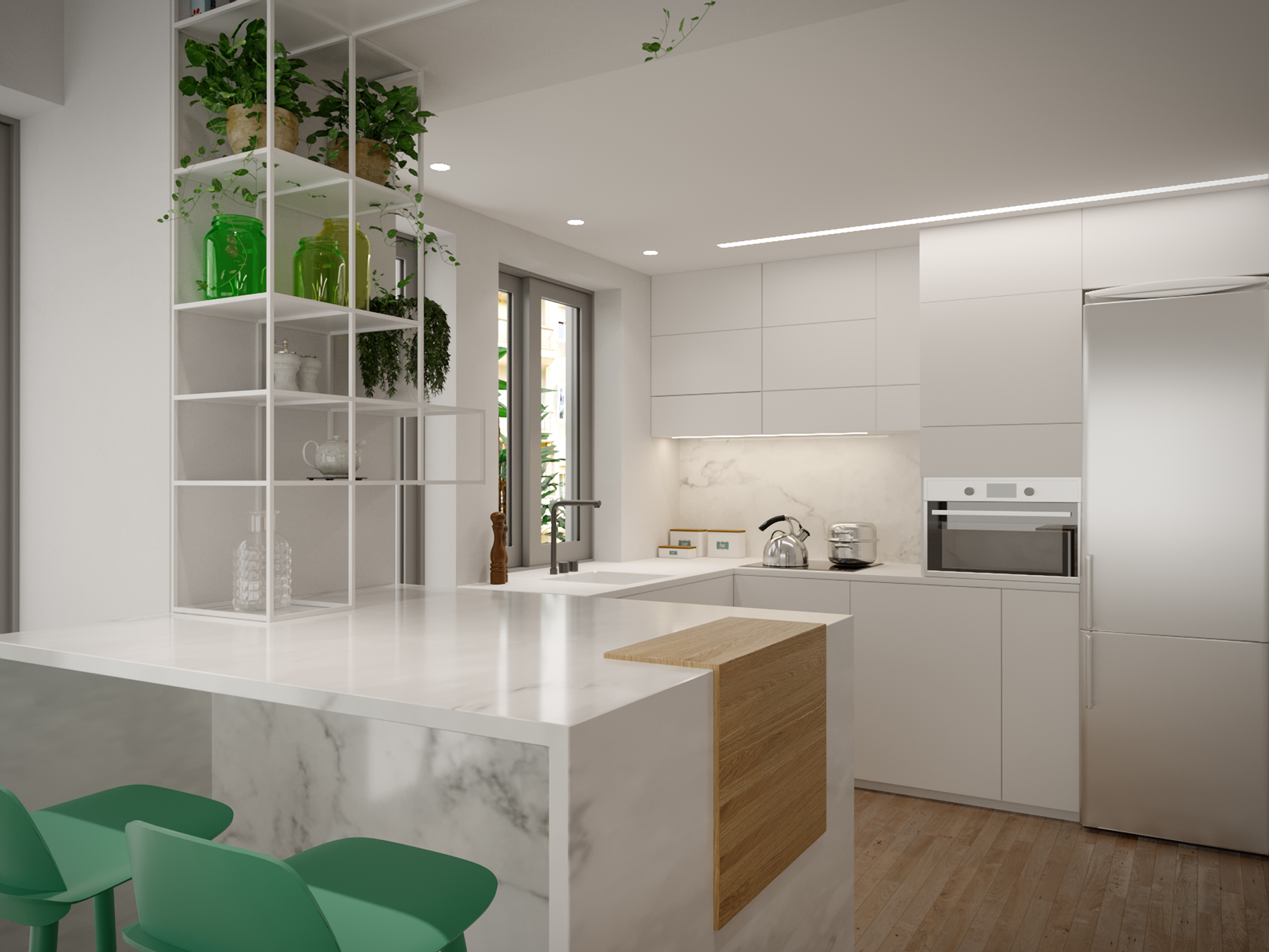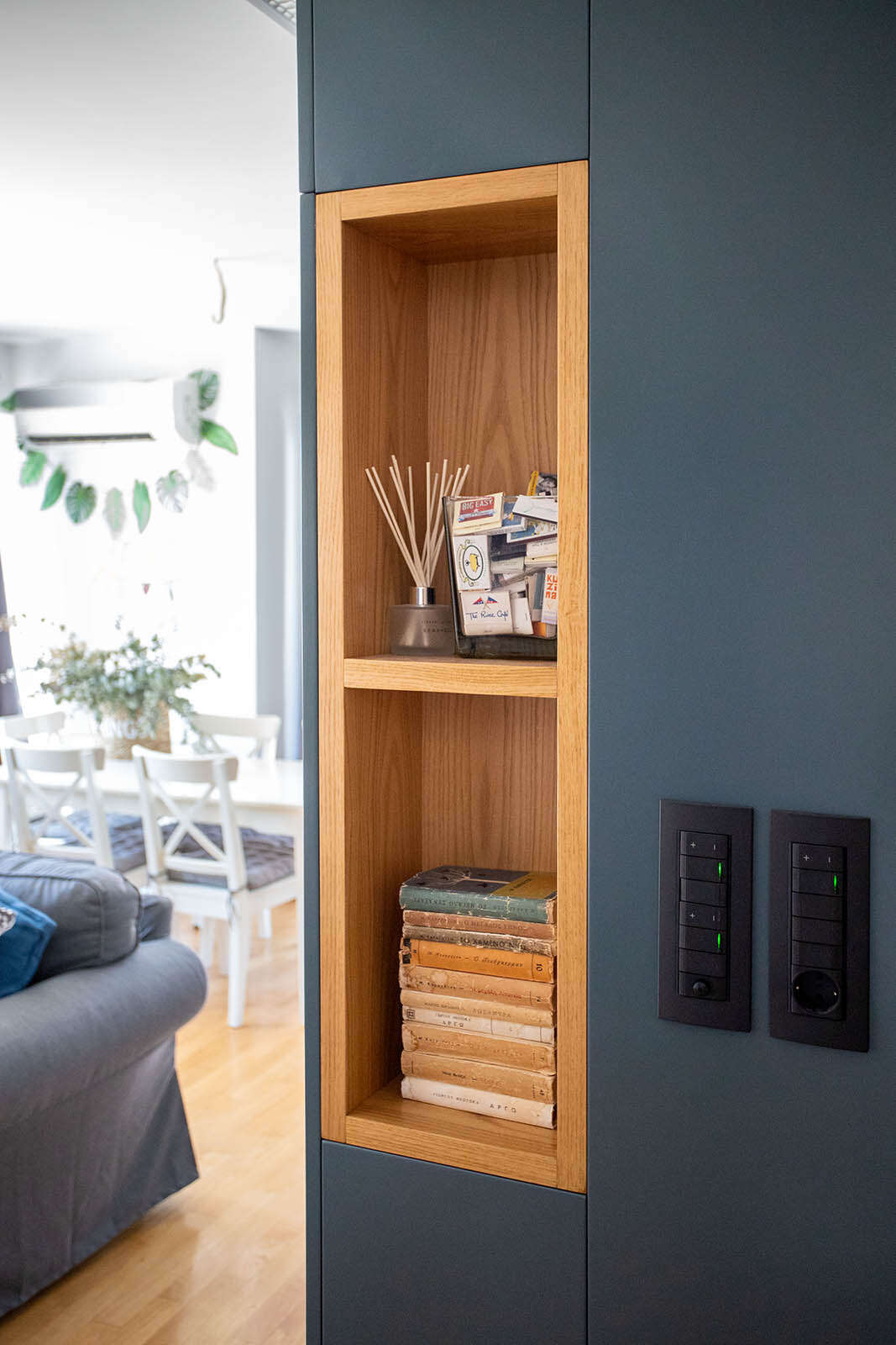 Το τελικό αποτέλεσμα είναι ένα διαμέρισμα πυκνής λειτουργικότητας και ευαίσθητης σύνθεσης. Οι χρήσεις συναντούνται με ακρίβεια. Ο χώρος αναπνέει.