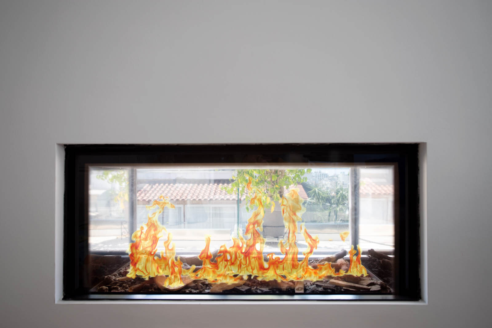 Το τζάκι τοποθετήθηκε σε νέα θέση. Μια γυάλινη πλευρά του κοιτά προς το μπαλκόνι, μετατρέποντάς το σε φωτεινή γέφυρα ανάμεσα σε εσωτερικό και εξωτερικό. Η φλόγα και η θέα συνυπάρχουν.