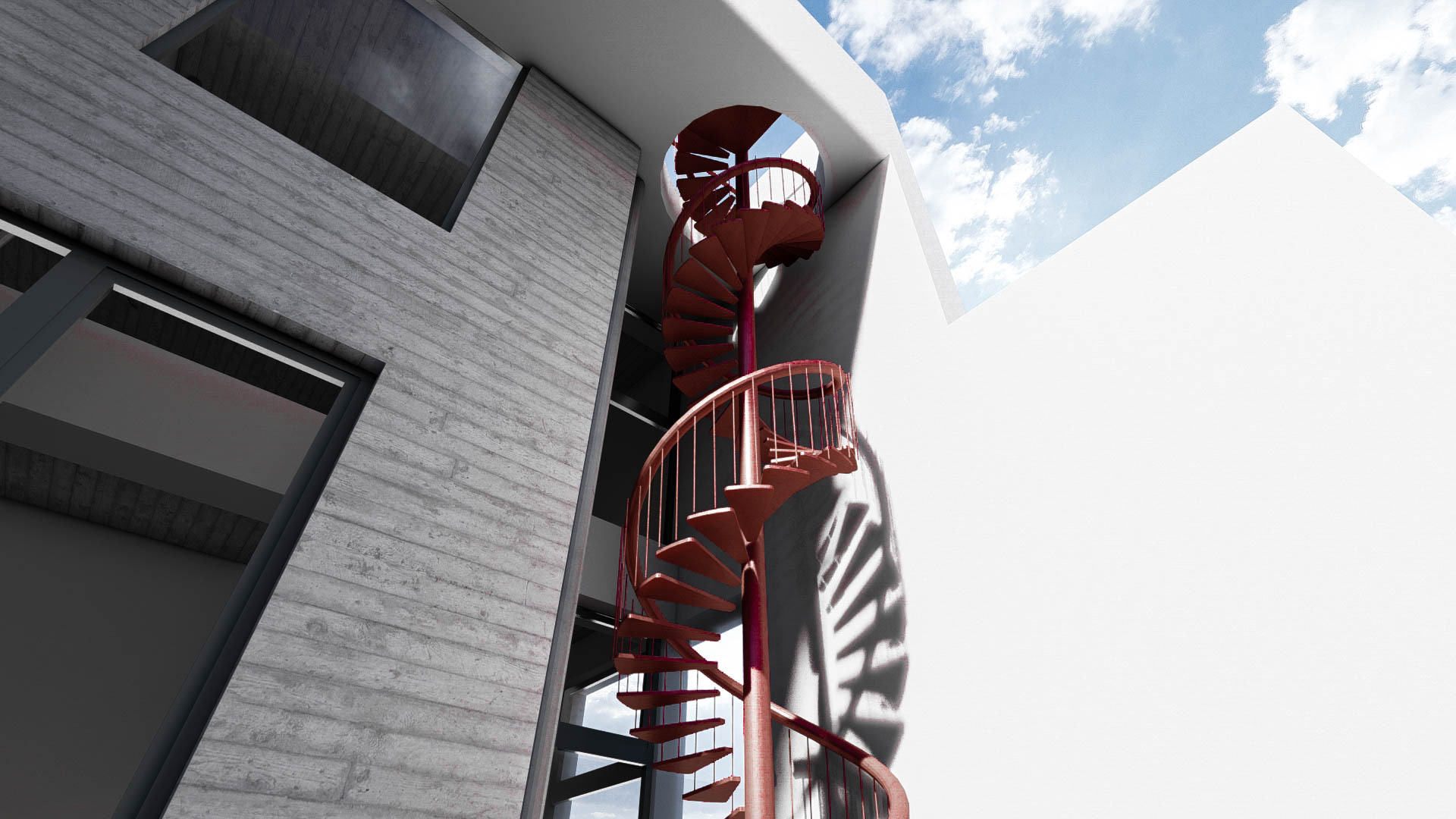 Το πράσινο γίνεται οργανικό κομμάτι της αρχιτεκτονικής. Αναπτύσσεται στο ισόγειο, στις ιδιωτικές αυλές των διαμερισμάτων, στο μεταλλικό περίβλημα του κλιμακοστασίου και στην ταράτσα. Το κλιμακοστάσιο διαχωρίζεται συνθετικά από τον βασικό όγκο και λειτουργεί ως αρχιτεκτονικός μοχλός, οργανώνοντας τις ροές και διαφοροποιώντας το κάθε διαμέρισμα. Η υλικότητα του όγκου της σκάλας το μετατρέπει σε ένα αυτόνομο, ελαφρύ στοιχείο που κινείται σε αντίστιξη με τη στιβαρότητα του κύριου κτιρίου.