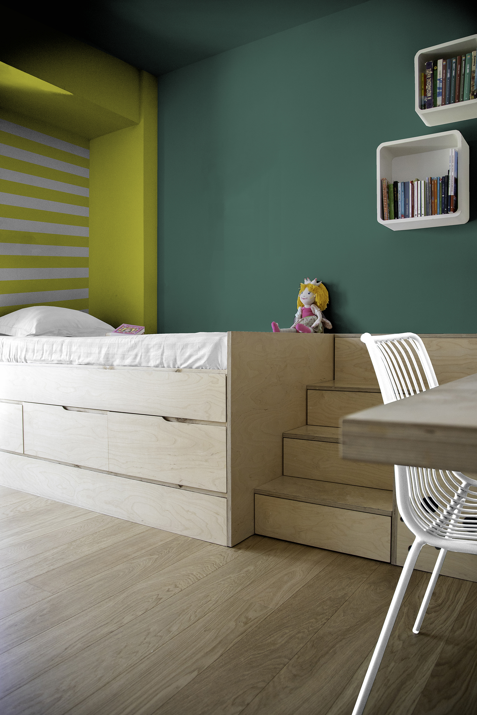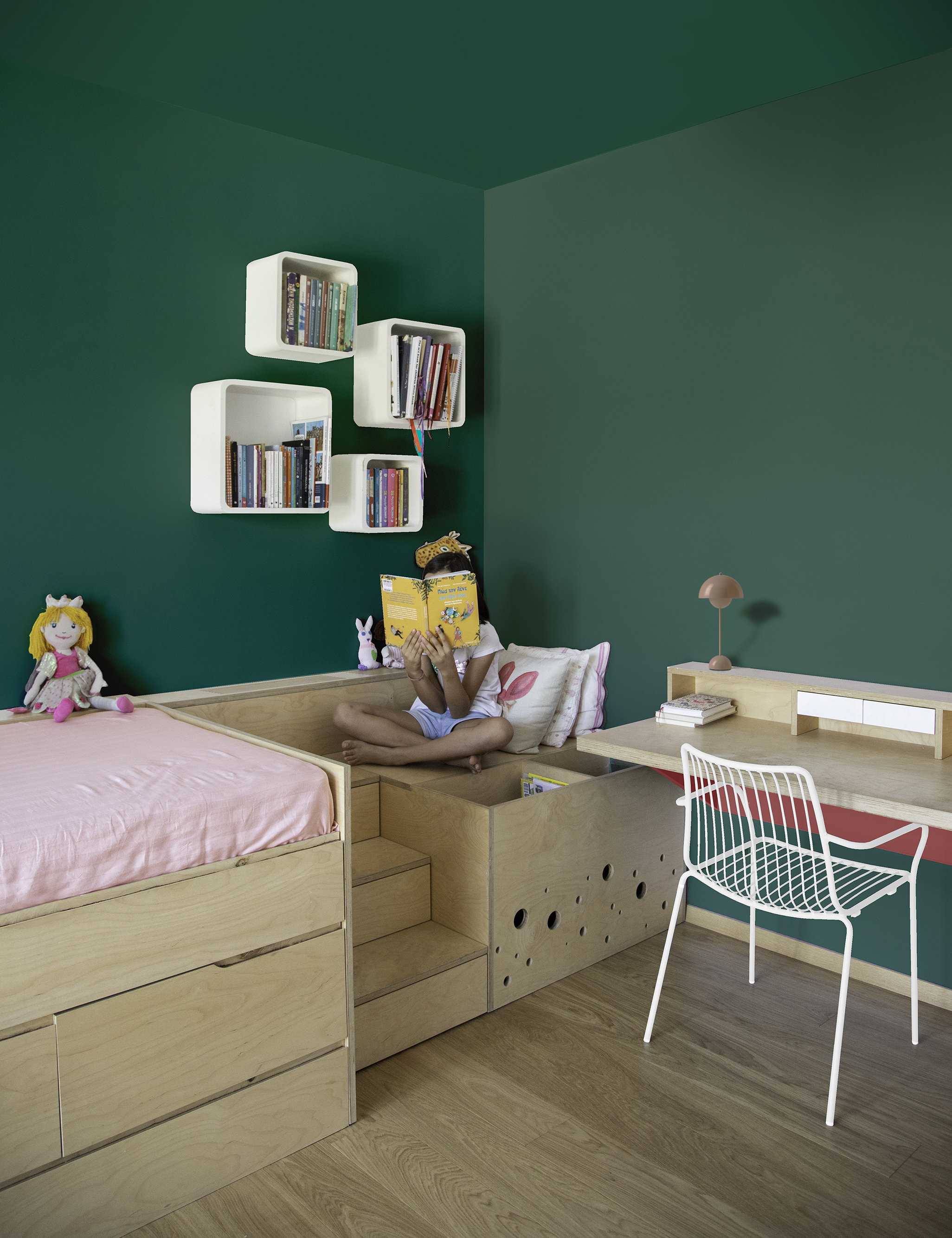 Ένας ενιαίος, πολυλειτουργικός κόσμος σε μικρή κλίμακα. Το μικροσύστημα της Έλι σχεδιάστηκε ως αρχιτεκτονική απάντηση στις ανάγκες ενός παιδιού που κατοικεί, παίζει, μελετά και φαντάζεται στον ίδιο χώρο. Το σύνολο συγκροτείται από τέσσερα βασικά στοιχεία: υπερυψωμένο κρεβάτι με αποθηκευτικό χώρο, ενσωματωμένο καθιστικό, σταθερό γραφείο και ξύλινη σκάλα που λειτουργεί ως σύνδεση και καθοδήγηση της καθημερινής ροής.