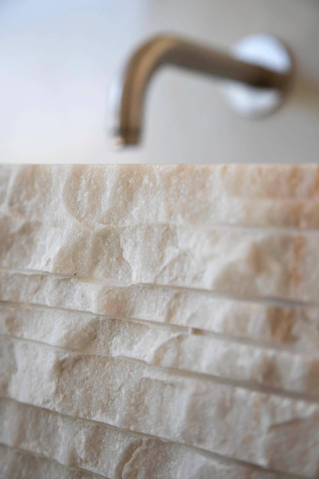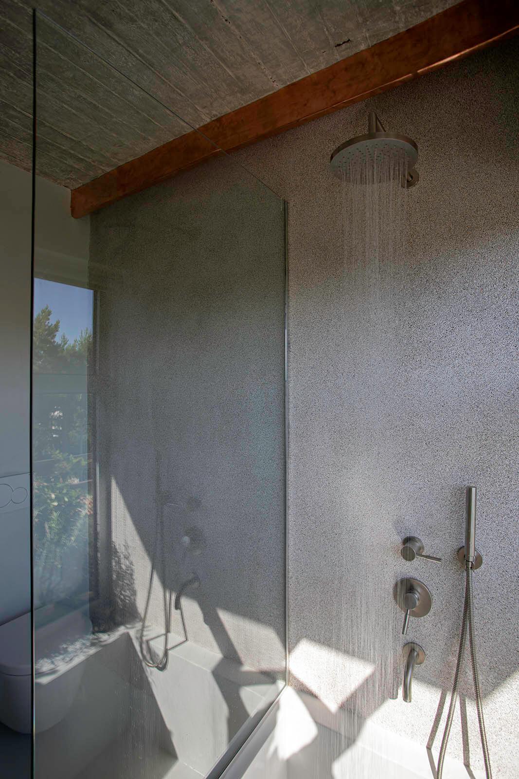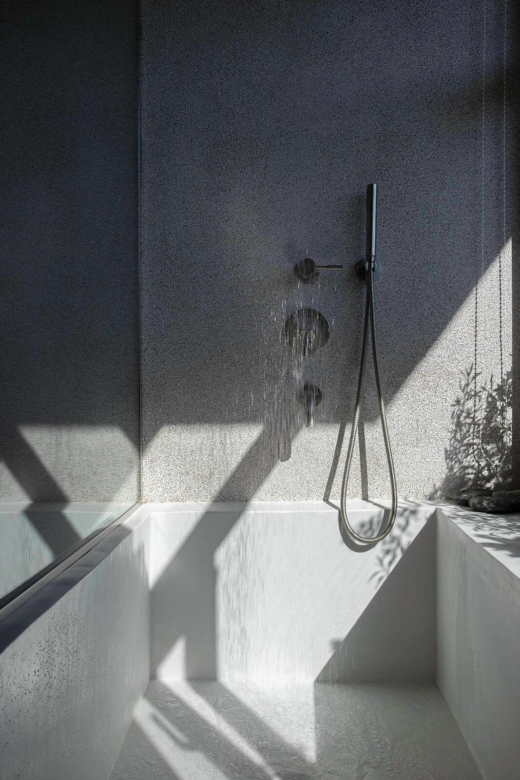 Η ύλη παραμένει ήρεμη. Τσιμεντοκονία, ήπιο μωσαϊκό, μάρμαρο, ξύλο, χαλκός, πλακάκι, τζάμι, ατμοσφαιρικό φως. Η μπανιέρα βρίσκεται στο κέντρο της εμπειρίας. Ο φωτισμός ακολουθεί την κίνηση του αναγνώστη.