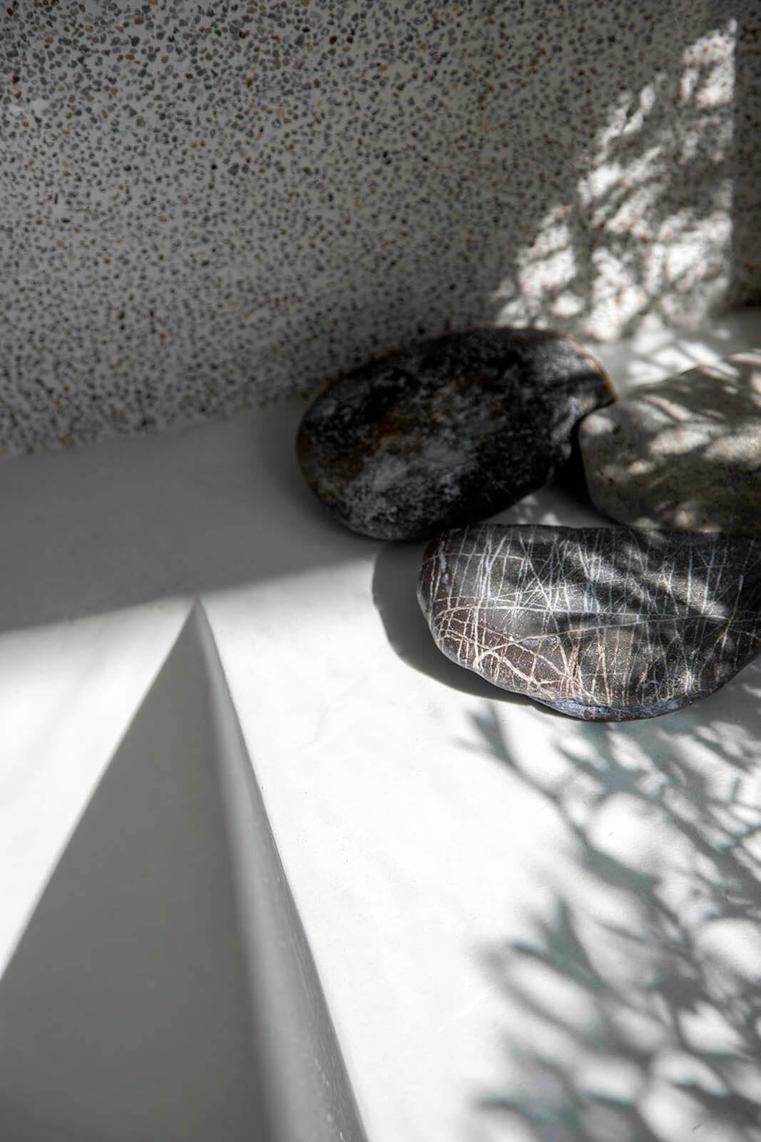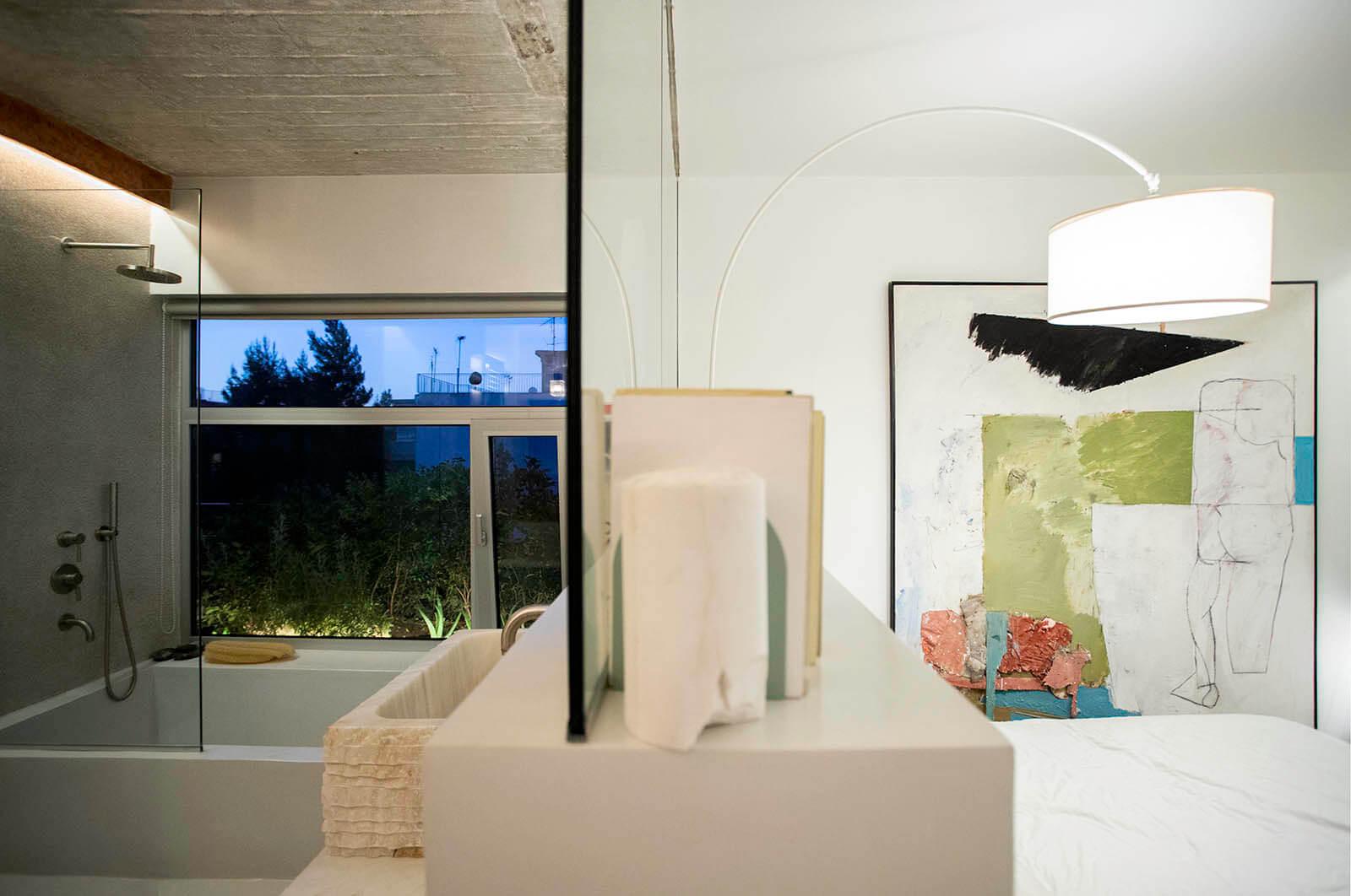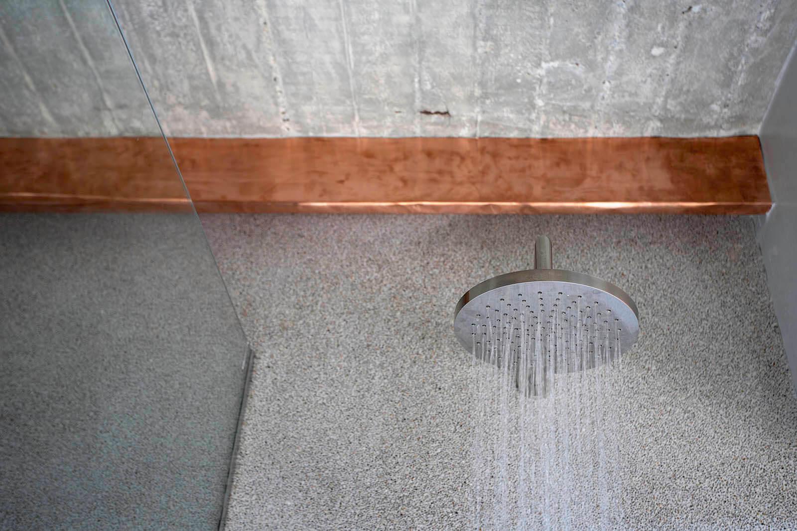 Η ύλη παραμένει ήρεμη. Τσιμεντοκονία, ήπιο μωσαϊκό, μάρμαρο, ξύλο, χαλκός, πλακάκι, τζάμι, ατμοσφαιρικό φως. Η μπανιέρα βρίσκεται στο κέντρο της εμπειρίας. Ο φωτισμός ακολουθεί την κίνηση του αναγνώστη.
