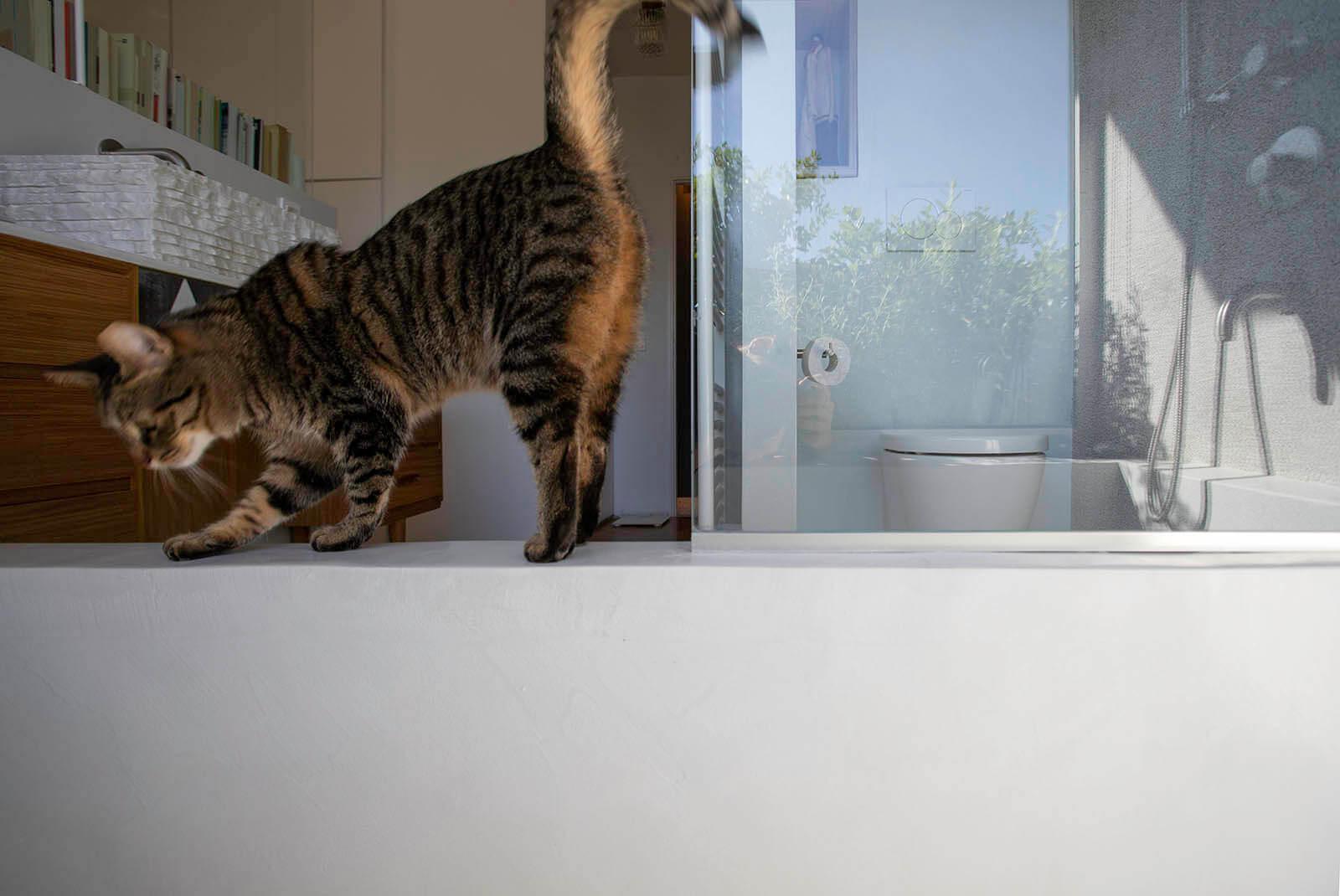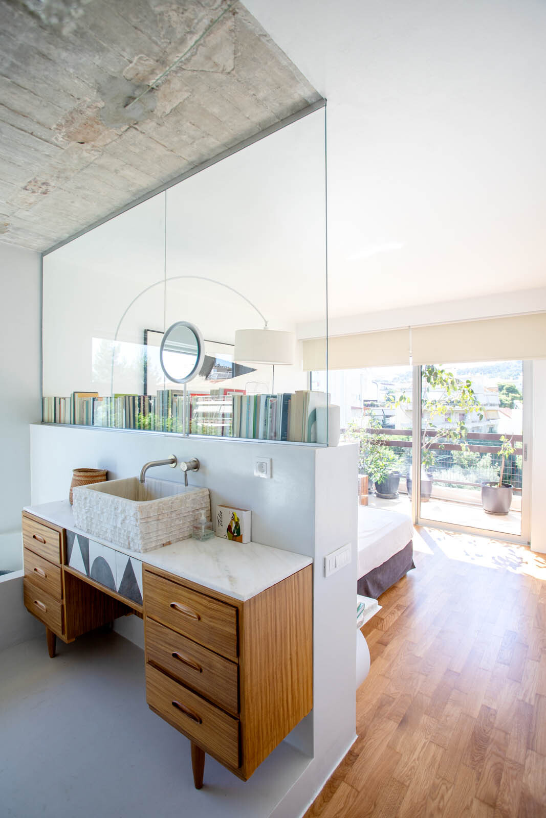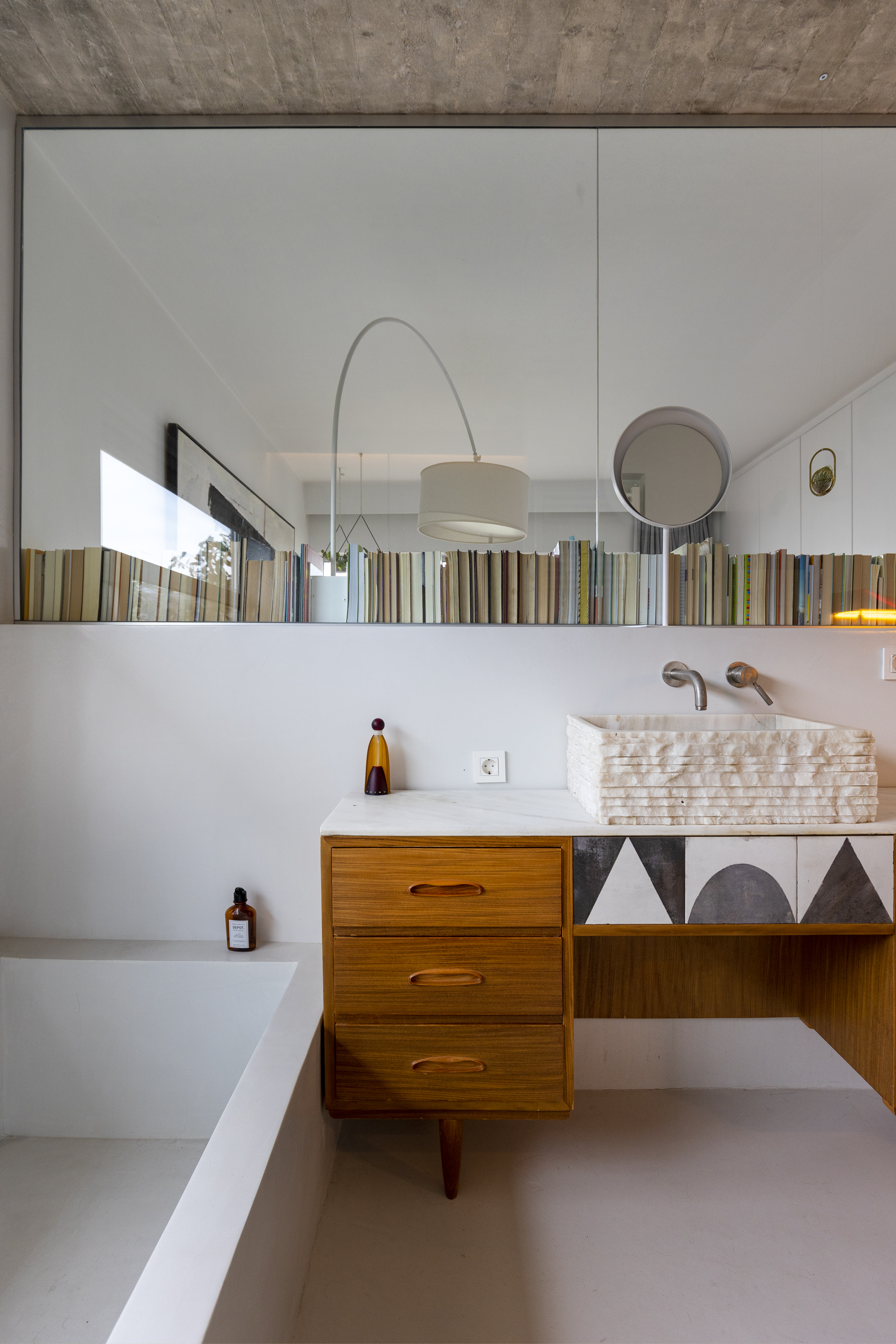 Κάθε υλικό υποστηρίζει την ακινησία και κάθε λεπτομέρεια ενισχύει τη συγκέντρωση. Το μπάνιο-βιβλιοθήκη προτείνει έναν τρόπο ζωής συντονισμένο με την επιθυμία για ηρεμία και βάθος. Η αρχιτεκτονική λειτουργεί εδώ ως φροντίδα.