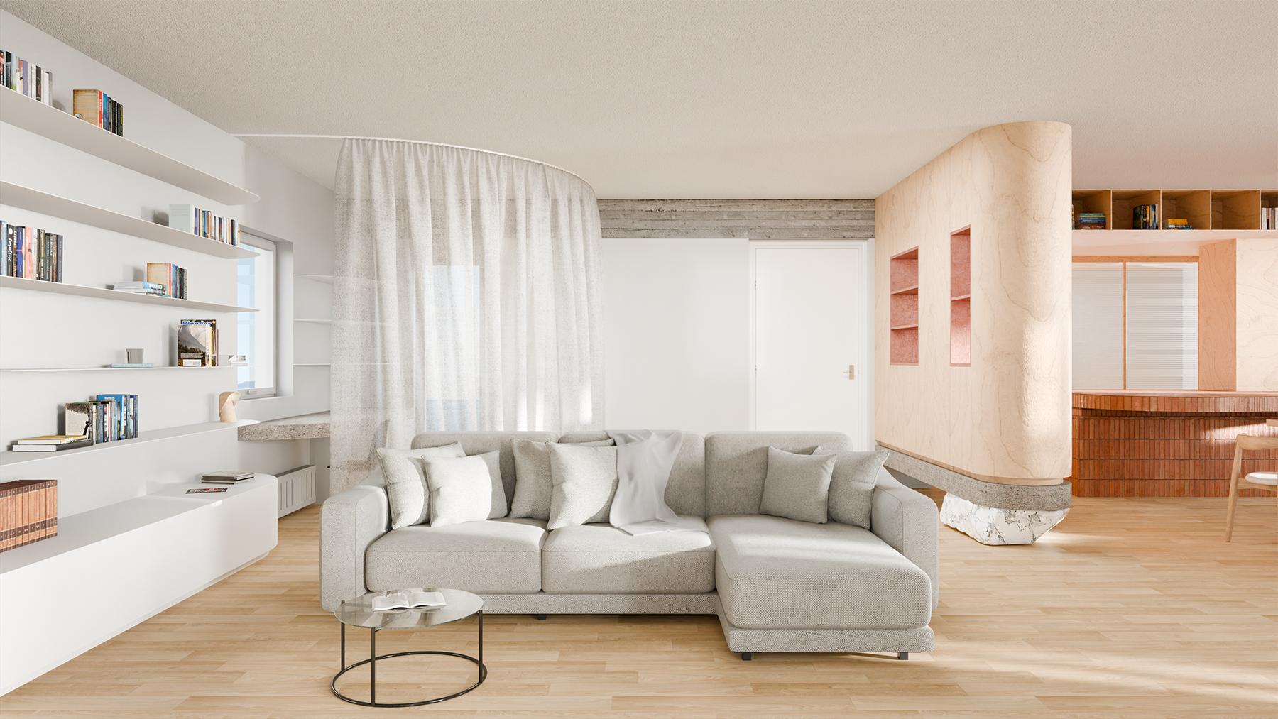 Η ανακαίνιση ενός διαμερίσματος της δεκαετίας του ’90 στρέφεται προς το φως, την υλικότητα και τη βλάστηση. Η επέμβαση επικεντρώνεται στο υπνοδωμάτιο, την κουζίνα, το καθιστικό και στη μετάβαση προς το εξωτερικό (μπαλκόνι 5ου ορόφου). Οι εσωτερικές διατάξεις επανασχεδιάστηκαν και τα υλικά επιλέχθηκαν για να υποχωρούν, αφήνοντας το χώρο να αναπνεύσει.