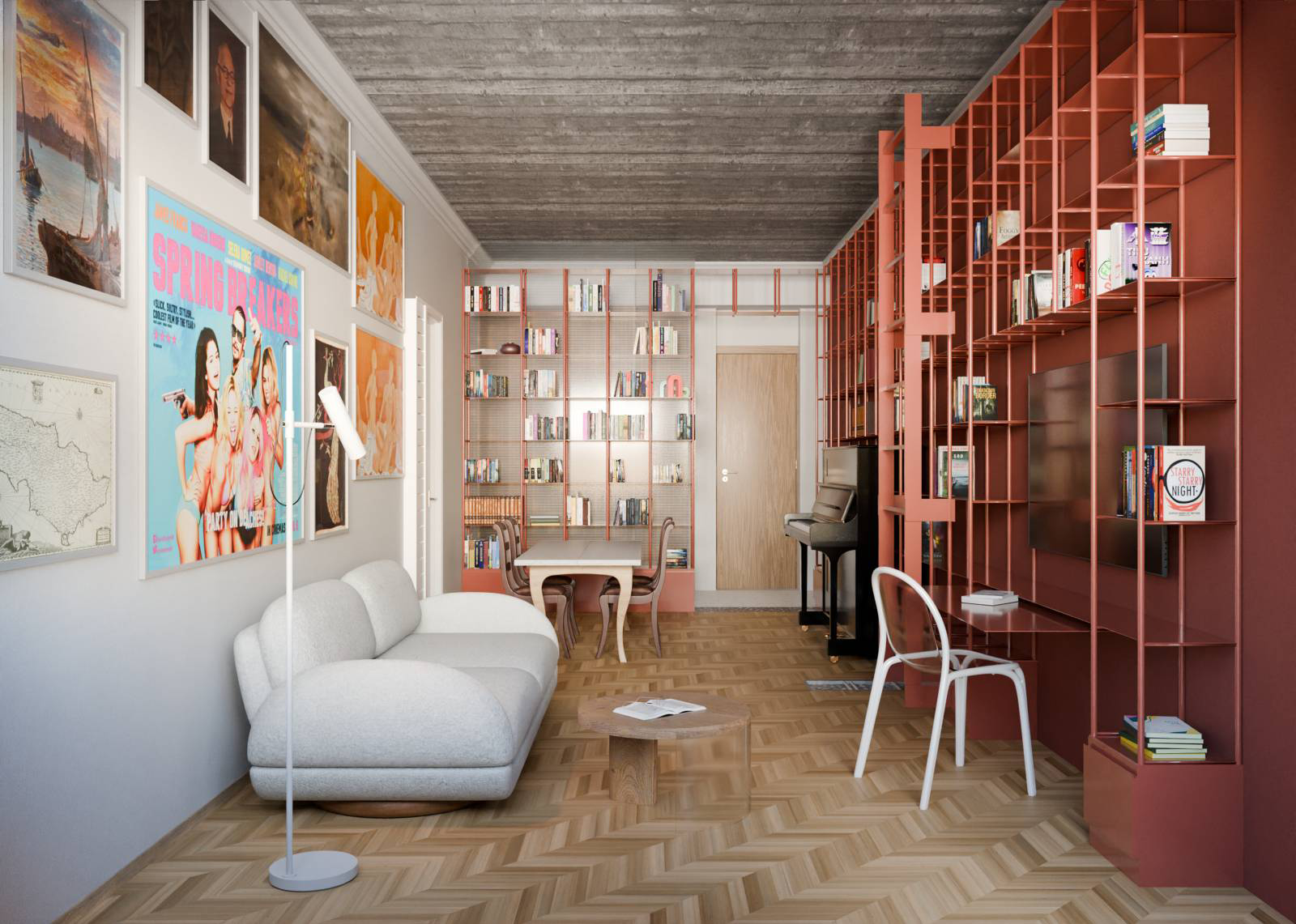 Η βιβλιοθήκη αποτελεί το χωρικό επίκεντρο του καθιστικού. Η θερμή κοκκινωπή της απόχρωση ενισχύει την αίσθηση θαλπωρής, ενώ η ανοιχτή της δομή την καθιστά ευέλικτη και ανάλαφρη.