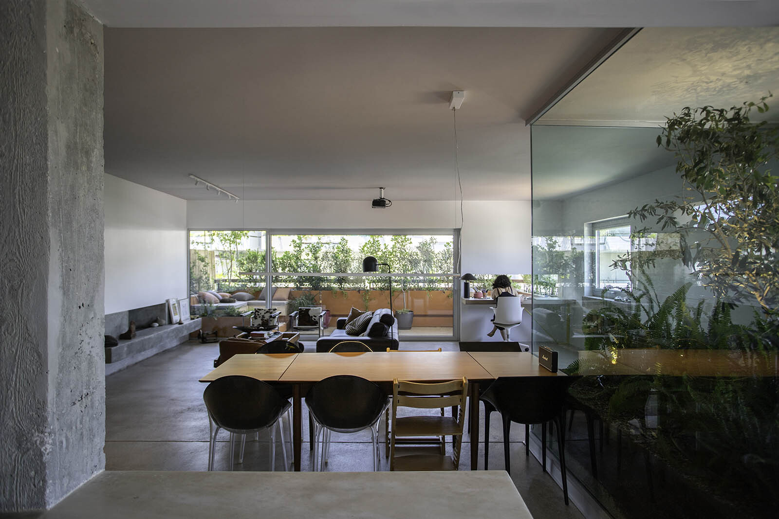 Pflanzen, Bäume und Boden sind Grundparameter des Familienalltags in der Wohnung, denn sie sind der Brennpunkt, um den sich der Plan entwickelt. Konstitutive Elemente der Identität der griechischen Landschaft, sowohl natürliche als auch vom Menschen geschaffene, kommen ins Spiel, um die Organisation, Form und Funktion der Wohnungsräume zu bestimmen: die skulpturale Einfachheit der Raum- und Volumengestaltung; die Herausbildung wichtiger Frei- und Halbfreigelände als gleichberechtigte Lebens- und Erlebnisräume mit den Innenräumen der Wohnung; die vollständige Ausnutzung der Verbindung und des Zusammenspiels zwischen diesen Räumen und einer Vielzahl von visuellen und funktionalen Werkzeugen und damit die optimale Nutzung des natürlichen Lichts, ob direkt oder diffus, und seiner Farbpalette, gefiltert durch Grünzonen und Glasflächen.