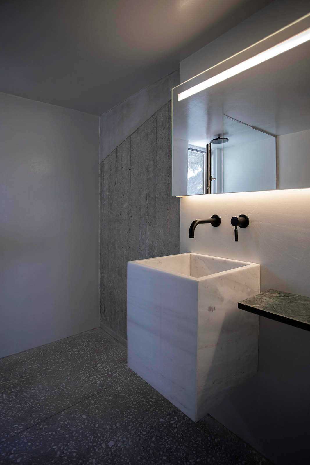 The material vocabulary is grounded in the sensory quality of textures, alternating between roughness and lyrical tactility. Cement mortar, exposed concrete structure, and a pebble-textured floor compose an experience designed for barefoot pleasure.