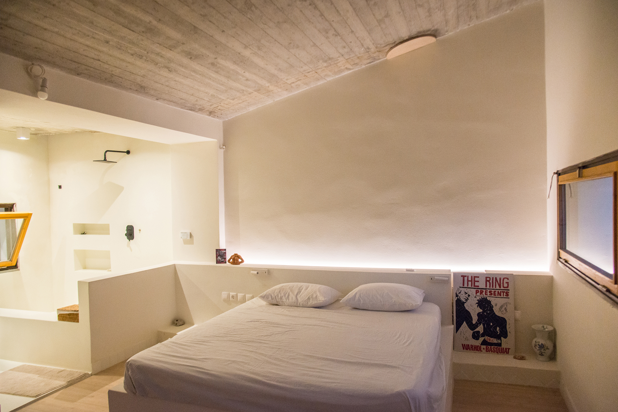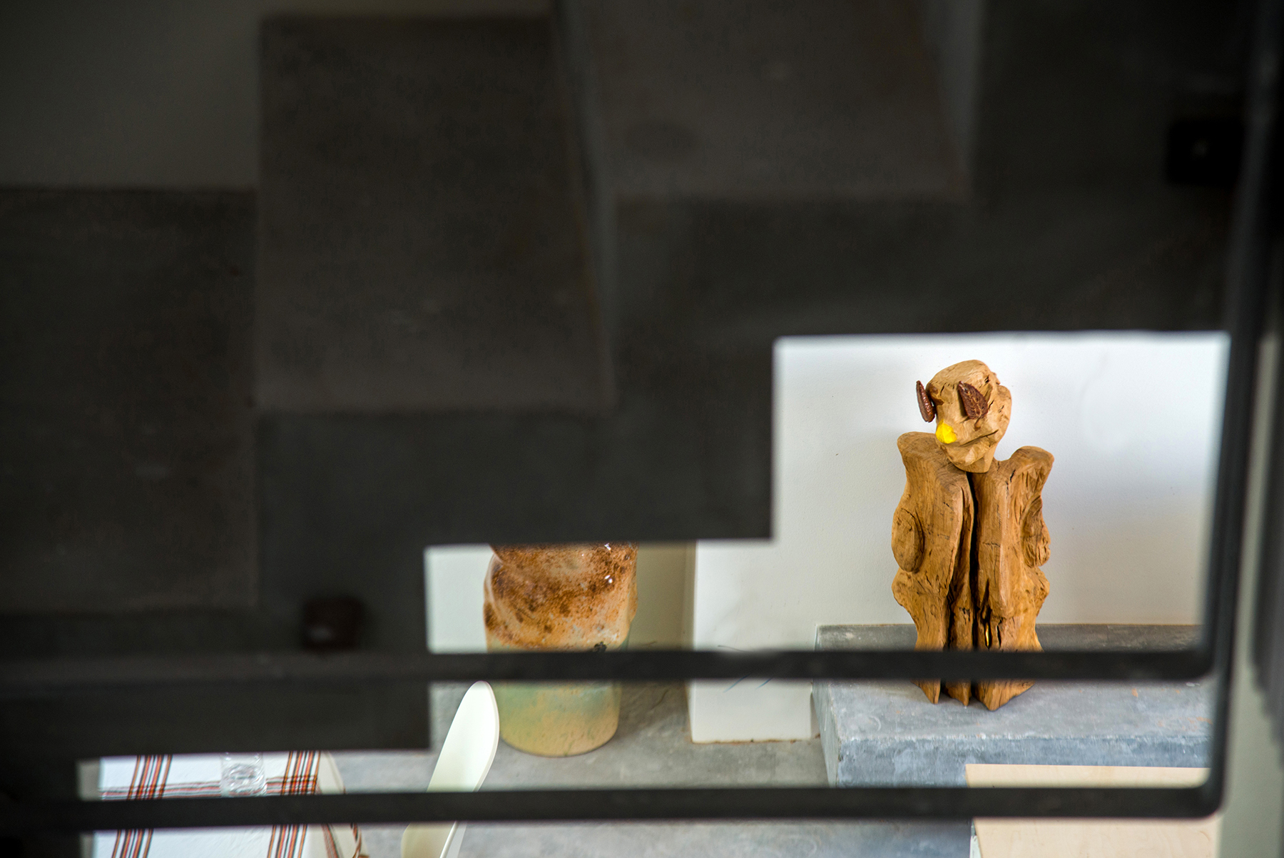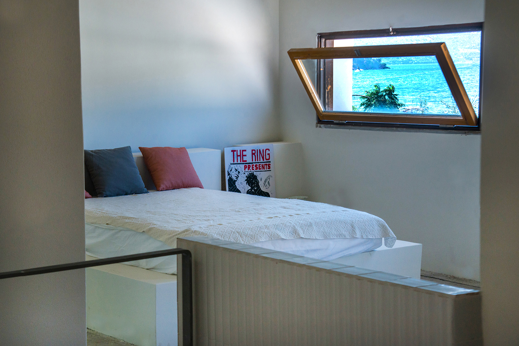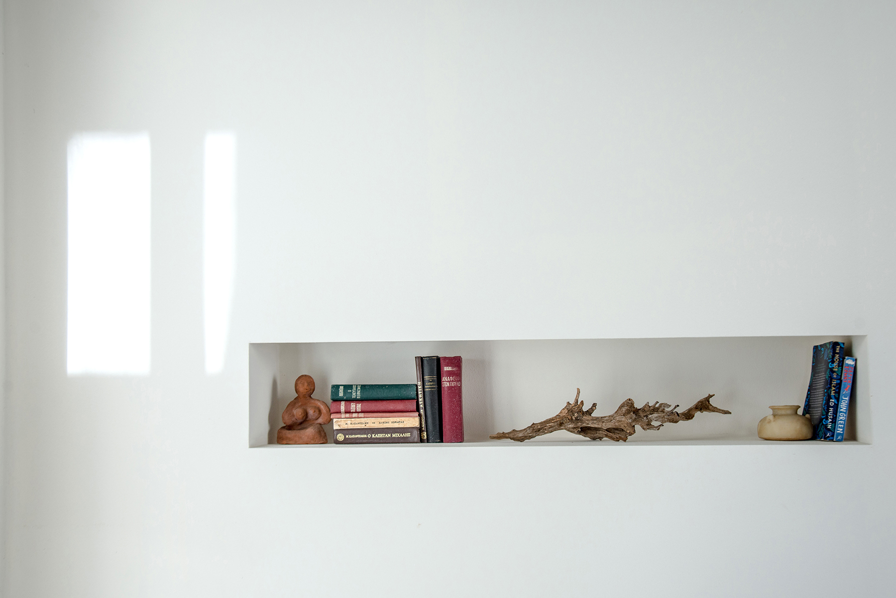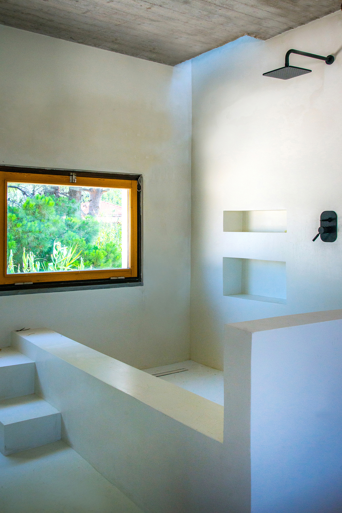 The materials—plaster, concrete, timber, and ceramic—are used in their natural state, without decoration or disguise. Within this simplicity, every junction and surface has been carefully composed, revealing a quiet depth of expression. The richness of the space emerges through texture, tone, and the subtle presence of things. Art appears not as display, but as gesture. Small interventions—improvised, tactile, intimate—reflect a creative life lived attentively, day by day. The plaster walls are smooth, thick, and whitewashed, creating a calm backdrop for everyday life. Niches are carved directly into the walls, becoming places for everyday objects and pieces of art—books, driftwood, ceramics. The built-in elements—bed bases, benches, and shelving—emerge seamlessly from the architecture, blurring the boundaries between structure, furniture, and sculpture. Nothing feels staged; everything appears quietly embedded in the life of the space.