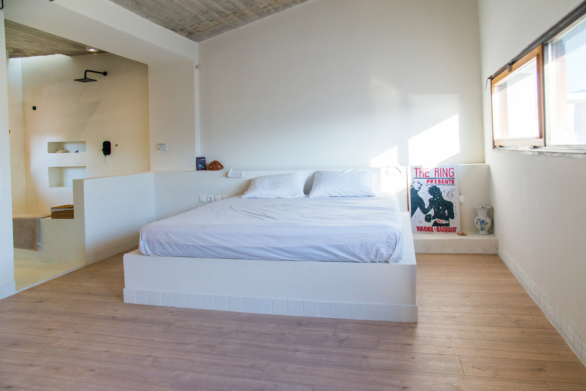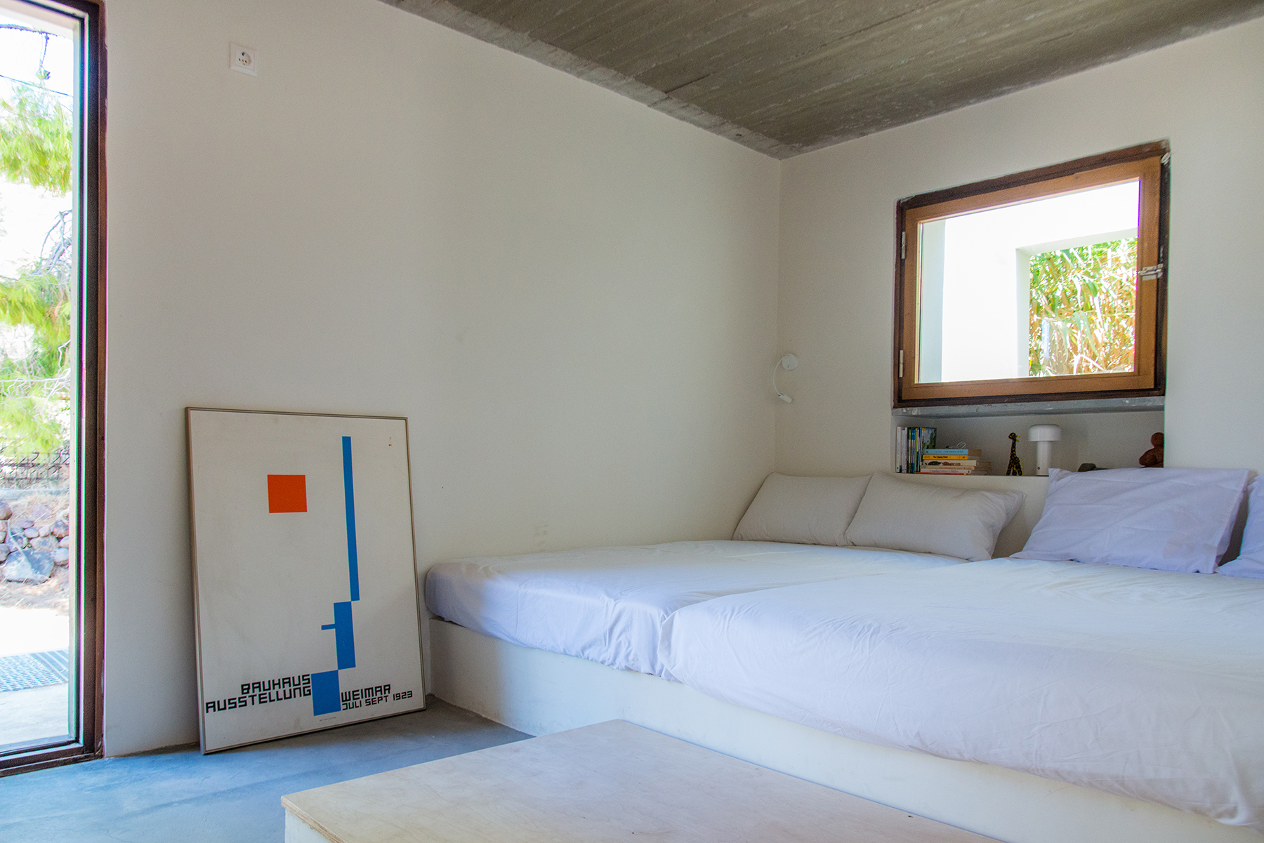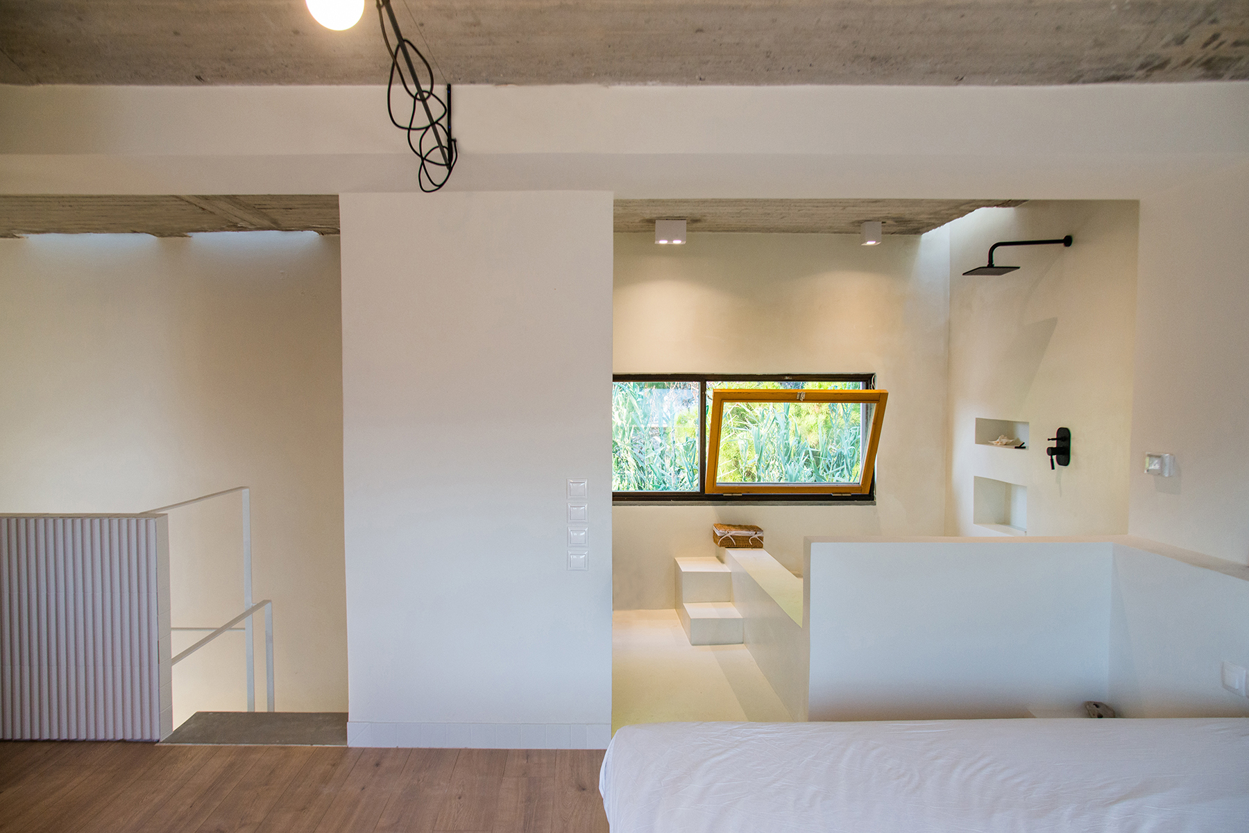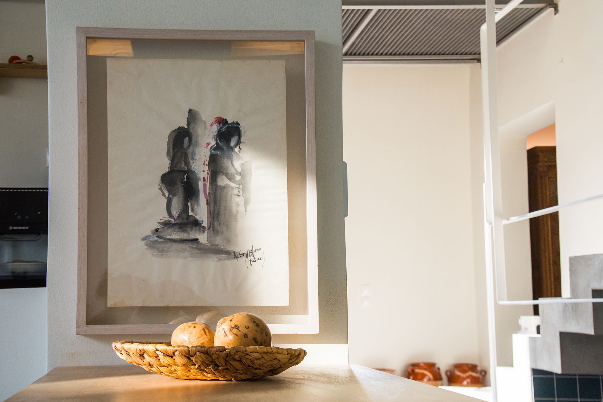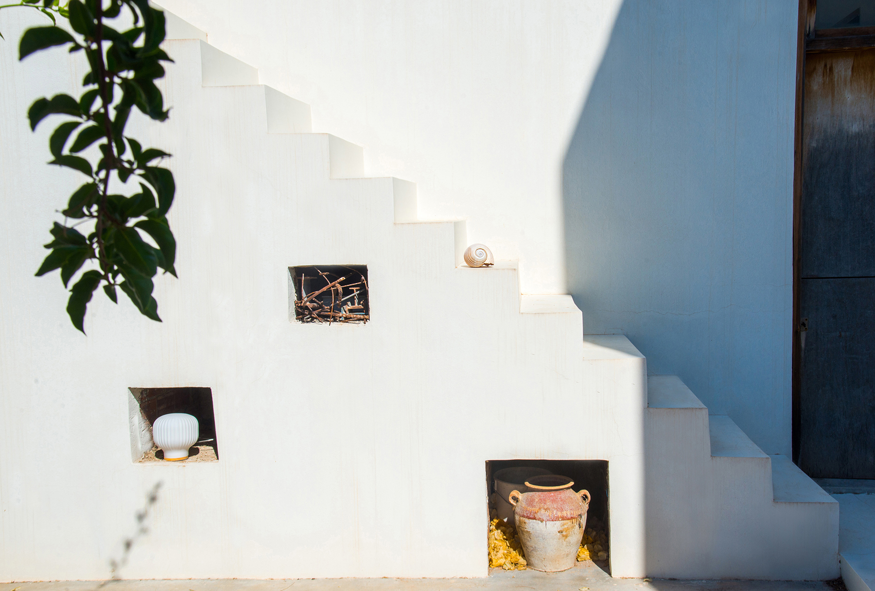 The materials—plaster, concrete, timber, and ceramic—are used in their natural state, without decoration or disguise. Within this simplicity, every junction and surface has been carefully composed, revealing a quiet depth of expression. The richness of the space emerges through texture, tone, and the subtle presence of things. Art appears not as display, but as gesture. Small interventions—improvised, tactile, intimate—reflect a creative life lived attentively, day by day. The plaster walls are smooth, thick, and whitewashed, creating a calm backdrop for everyday life. Niches are carved directly into the walls, becoming places for everyday objects and pieces of art—books, driftwood, ceramics. The built-in elements—bed bases, benches, and shelving—emerge seamlessly from the architecture, blurring the boundaries between structure, furniture, and sculpture. Nothing feels staged; everything appears quietly embedded in the life of the space.