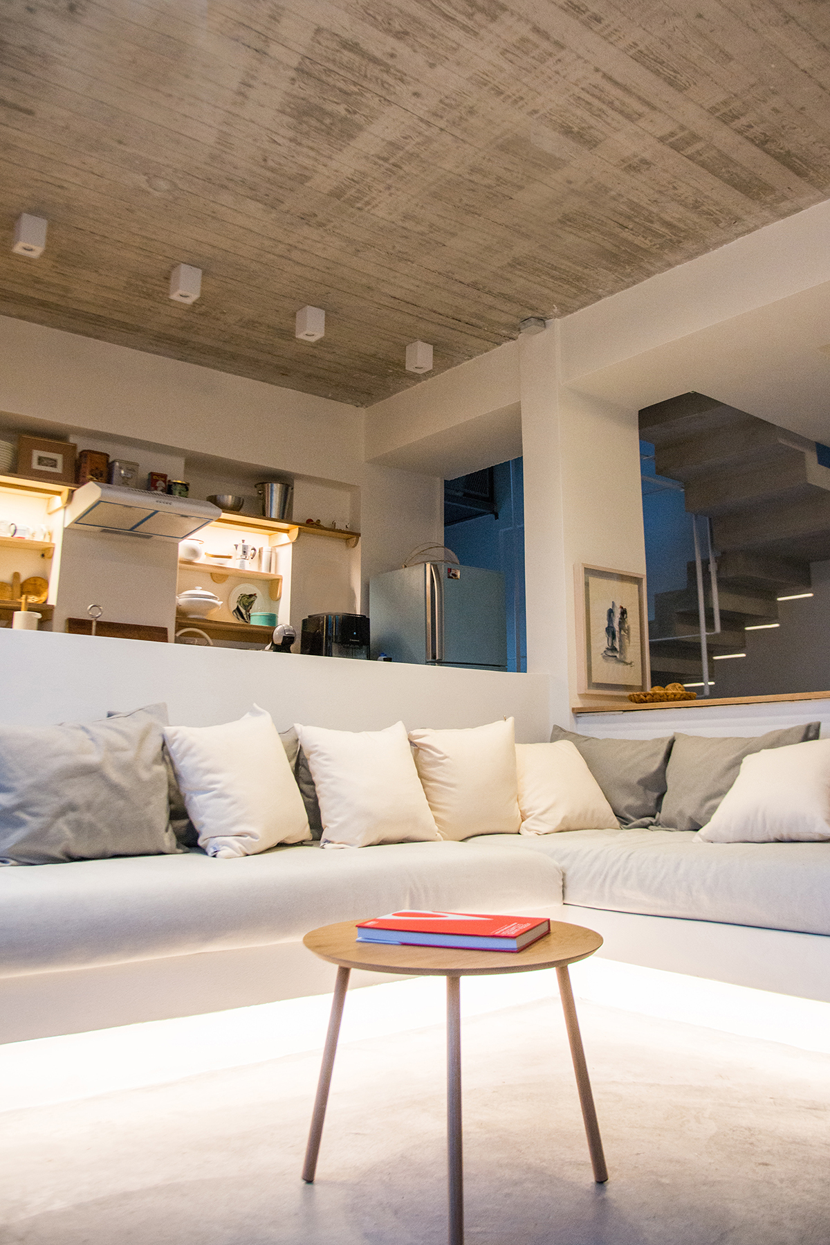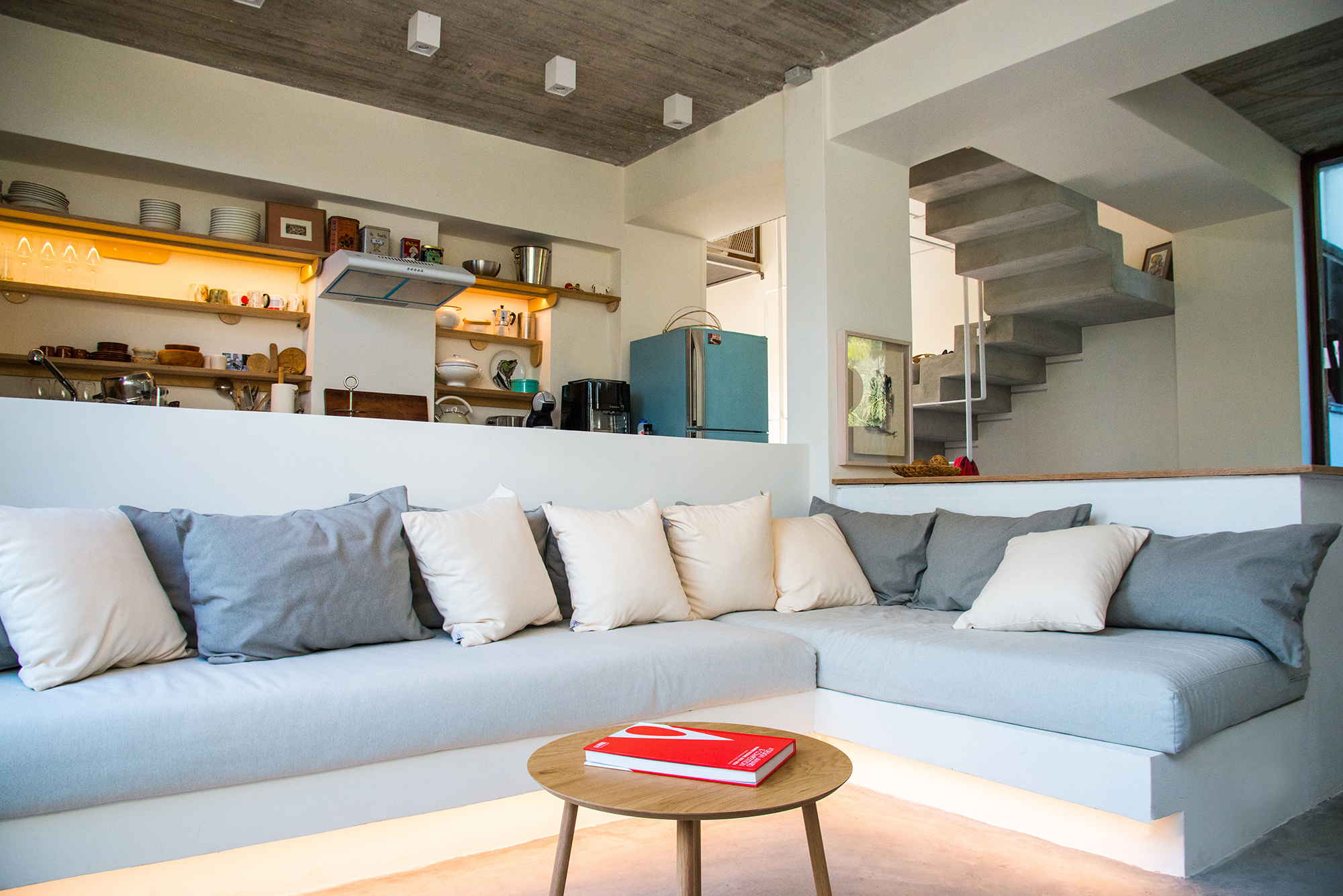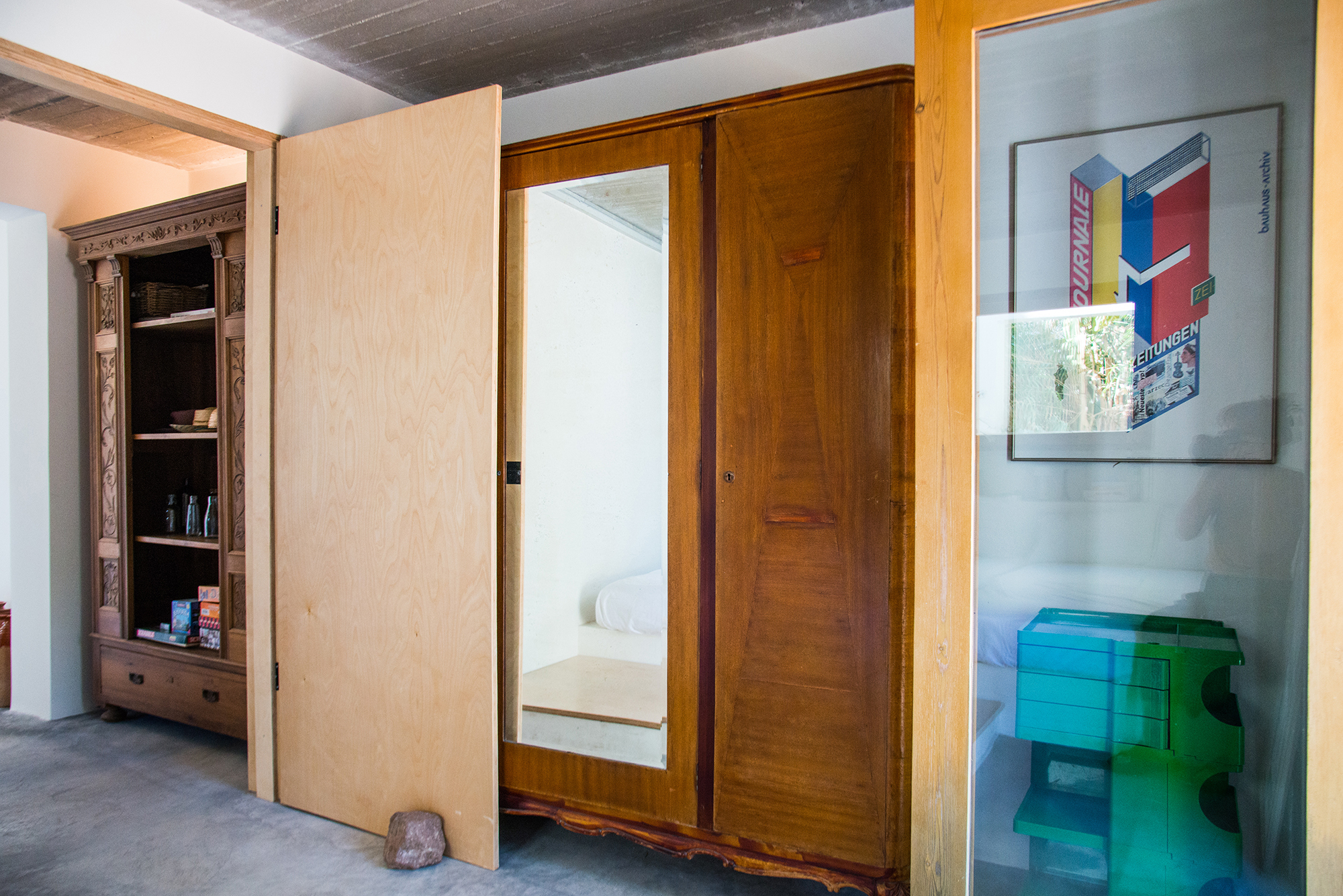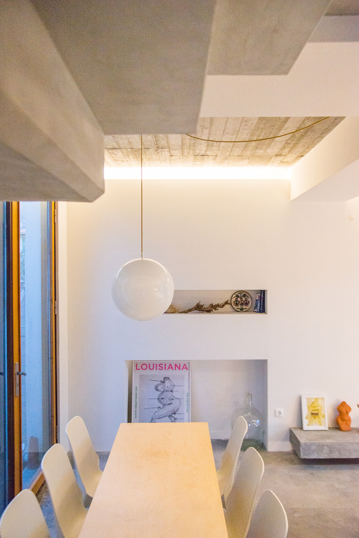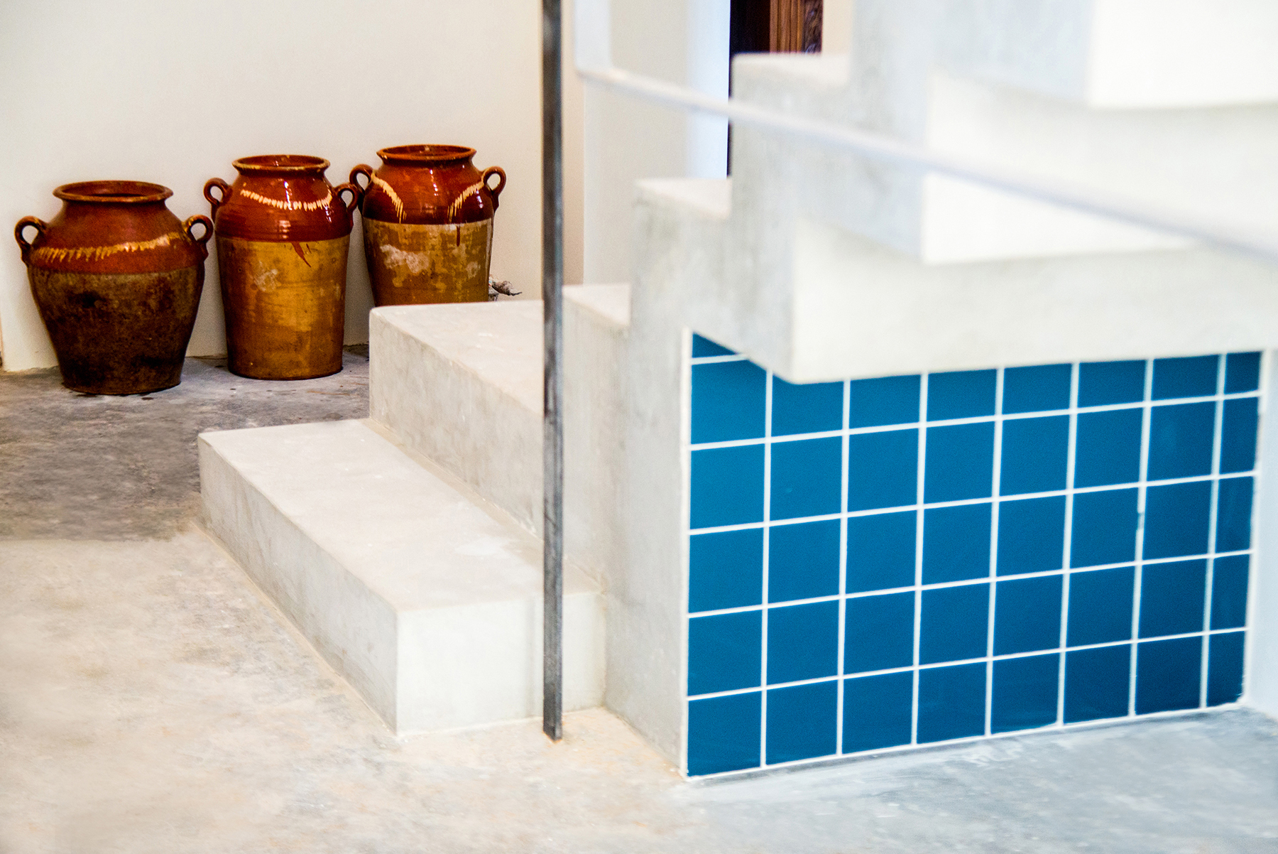 The materials—plaster, concrete, timber, and ceramic—are used in their natural state, without decoration or disguise. Within this simplicity, every junction and surface has been carefully composed, revealing a quiet depth of expression. The richness of the space emerges through texture, tone, and the subtle presence of things. Art appears not as display, but as gesture. Small interventions—improvised, tactile, intimate—reflect a creative life lived attentively, day by day. The plaster walls are smooth, thick, and whitewashed, creating a calm backdrop for everyday life. Niches are carved directly into the walls, becoming places for everyday objects and pieces of art—books, driftwood, ceramics. The built-in elements—bed bases, benches, and shelving—emerge seamlessly from the architecture, blurring the boundaries between structure, furniture, and sculpture. Nothing feels staged; everything appears quietly embedded in the life of the space.