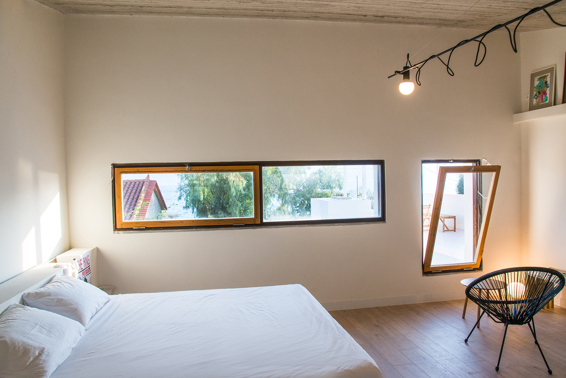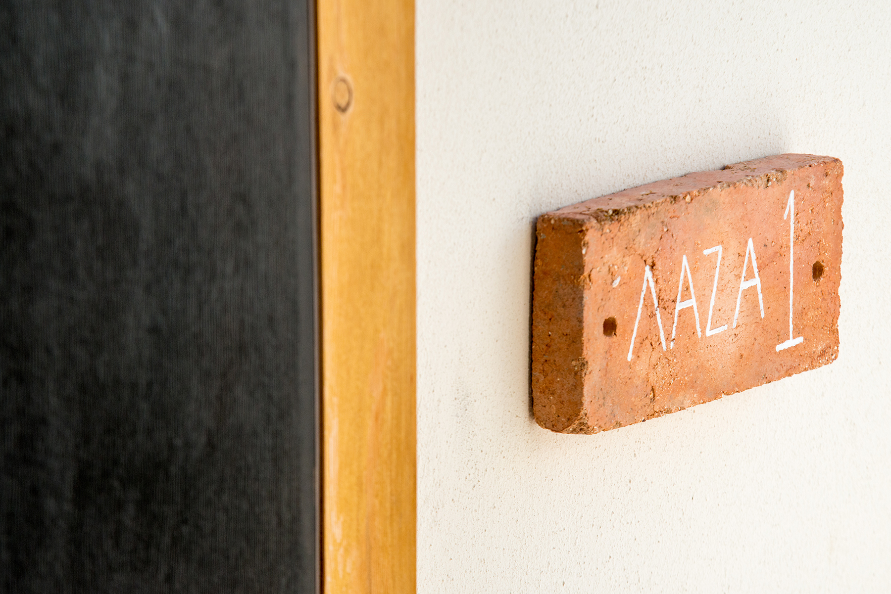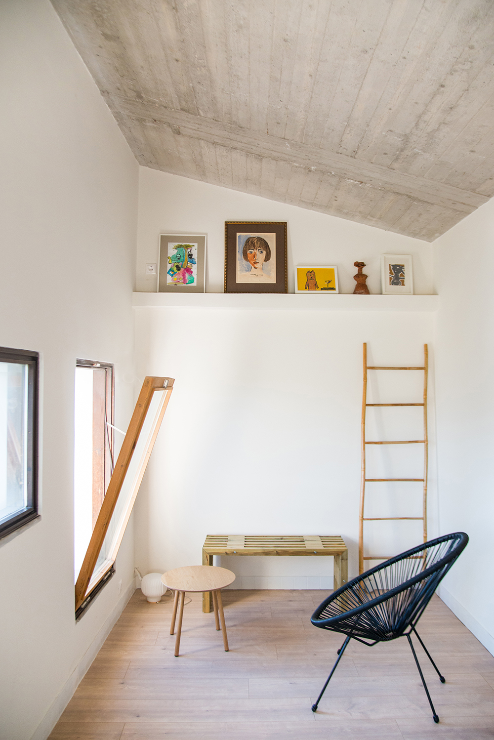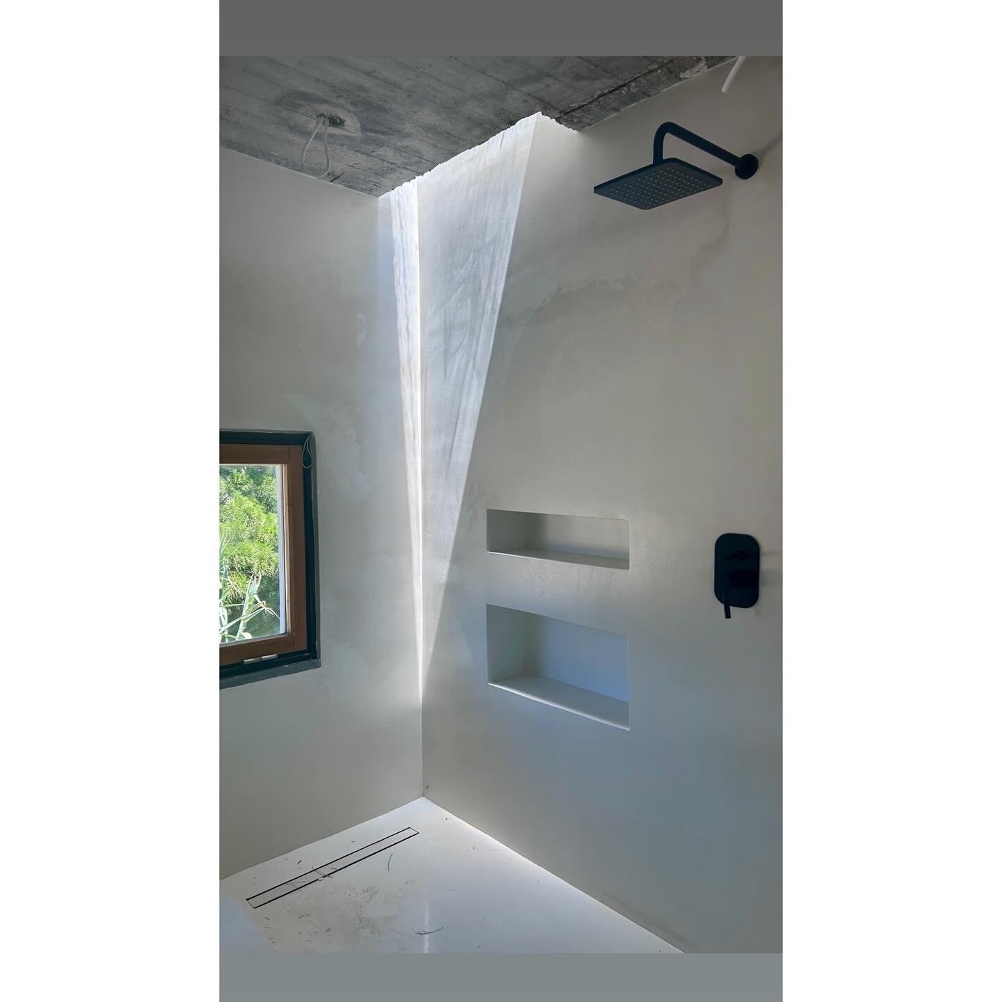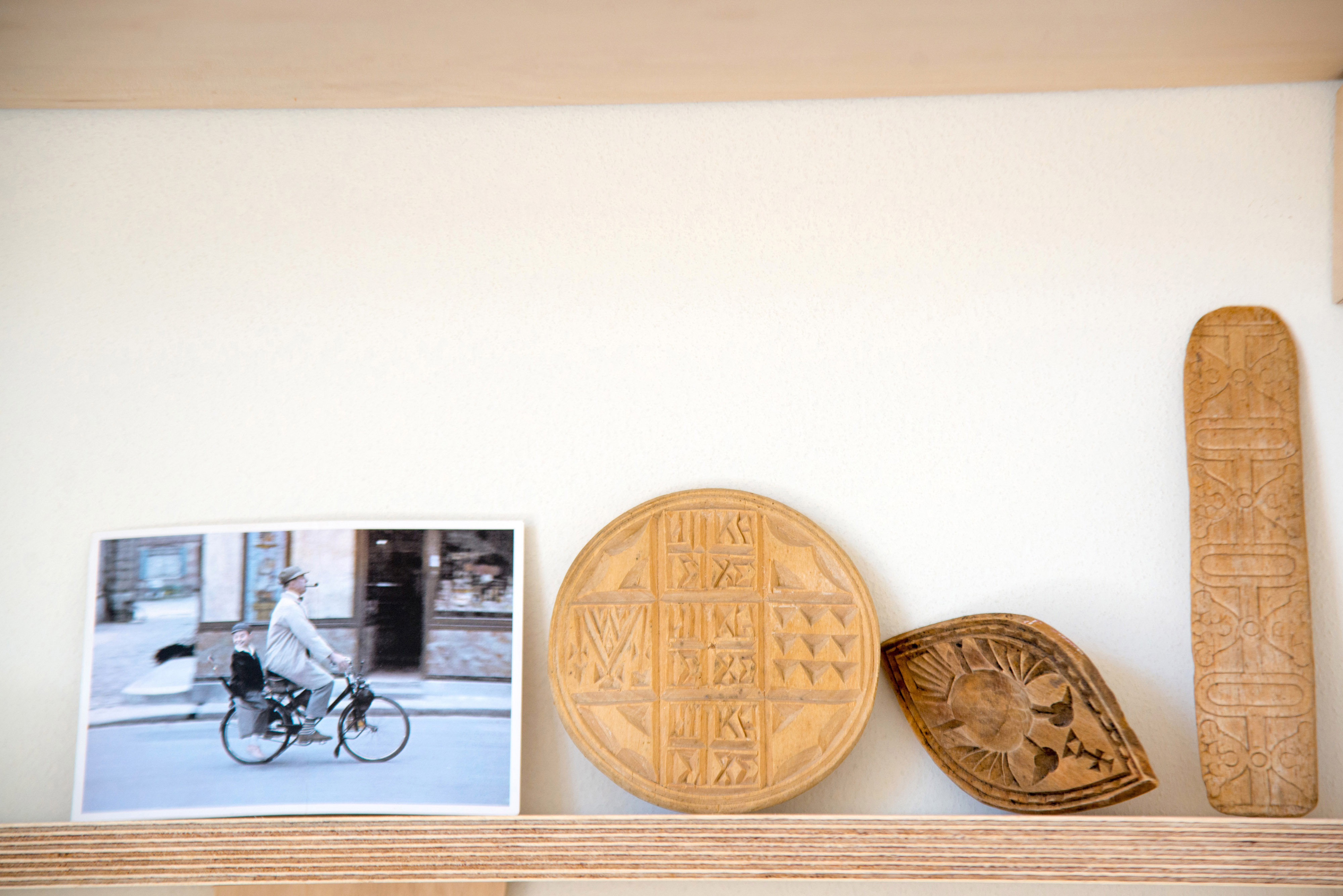 The materials—plaster, concrete, timber, and ceramic—are used in their natural state, without decoration or disguise. Within this simplicity, every junction and surface has been carefully composed, revealing a quiet depth of expression. The richness of the space emerges through texture, tone, and the subtle presence of things. Art appears not as display, but as gesture. Small interventions—improvised, tactile, intimate—reflect a creative life lived attentively, day by day. The plaster walls are smooth, thick, and whitewashed, creating a calm backdrop for everyday life. Niches are carved directly into the walls, becoming places for everyday objects and pieces of art—books, driftwood, ceramics. The built-in elements—bed bases, benches, and shelving—emerge seamlessly from the architecture, blurring the boundaries between structure, furniture, and sculpture. Nothing feels staged; everything appears quietly embedded in the life of the space.