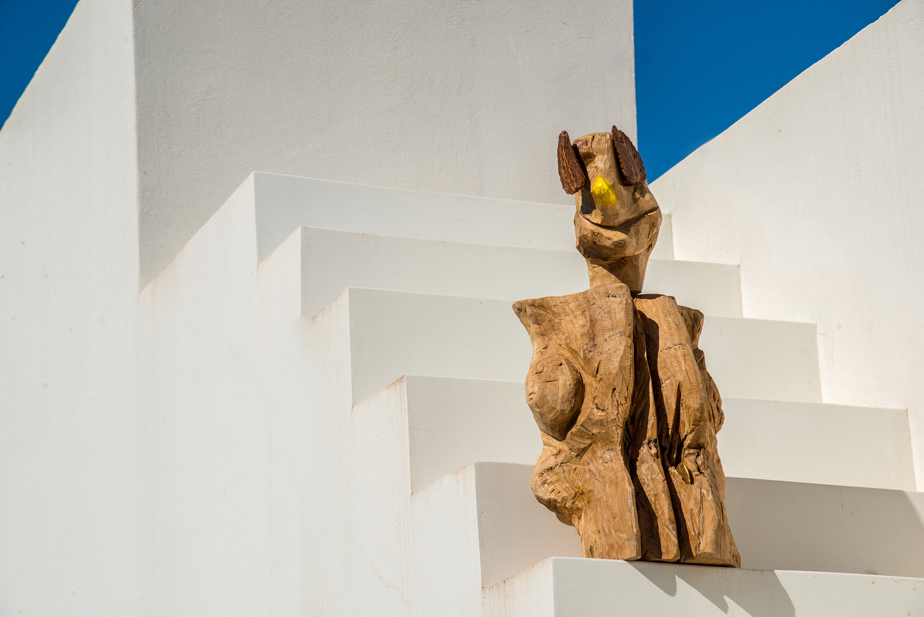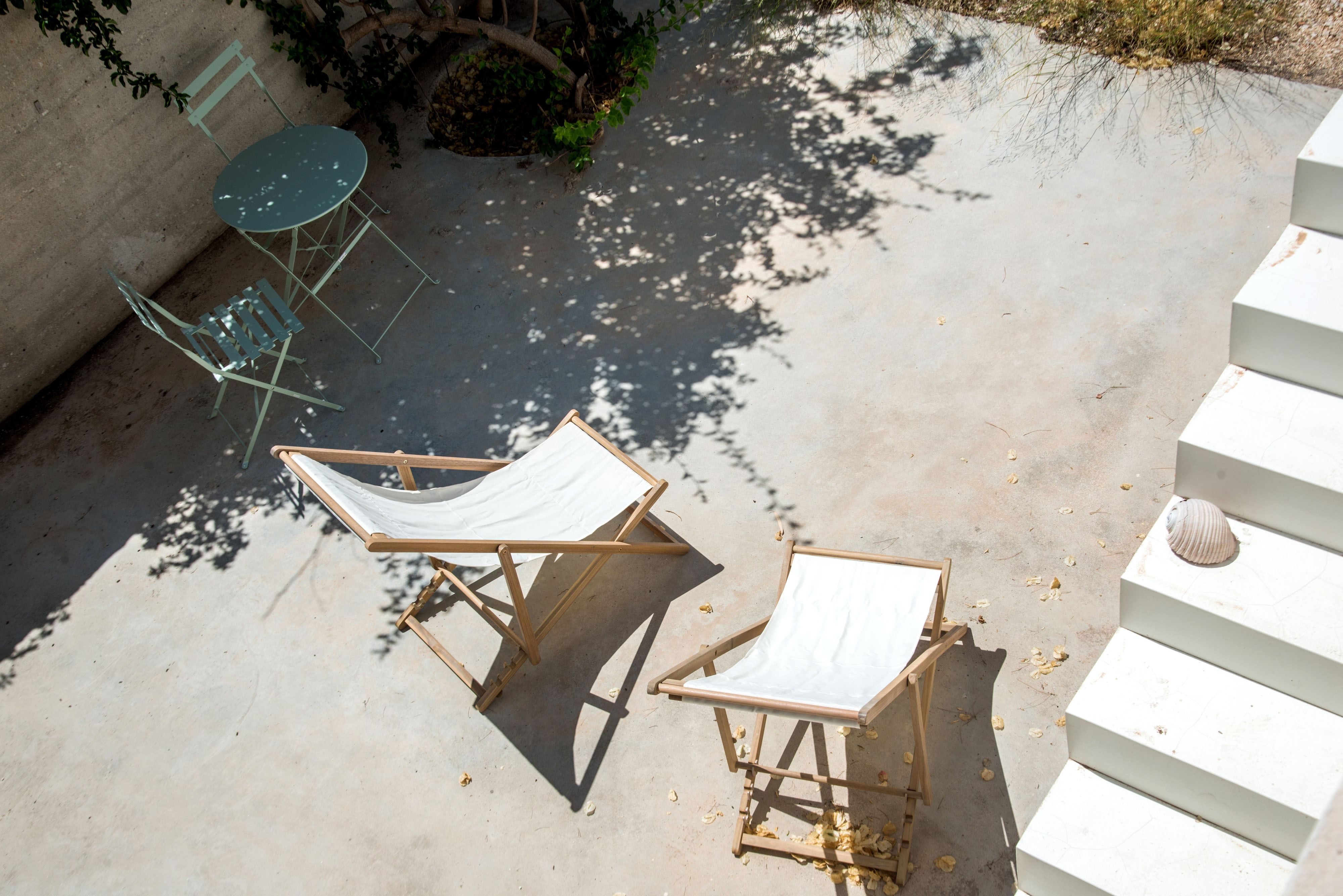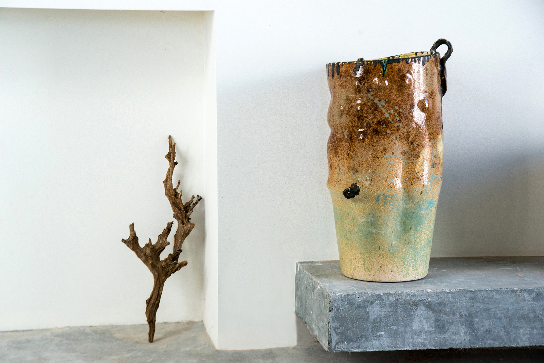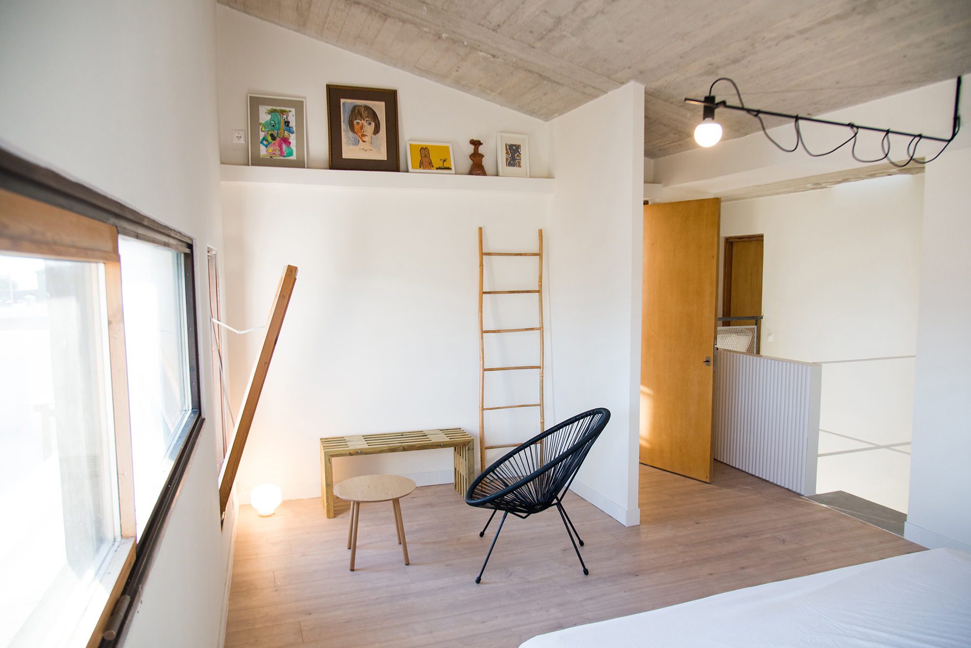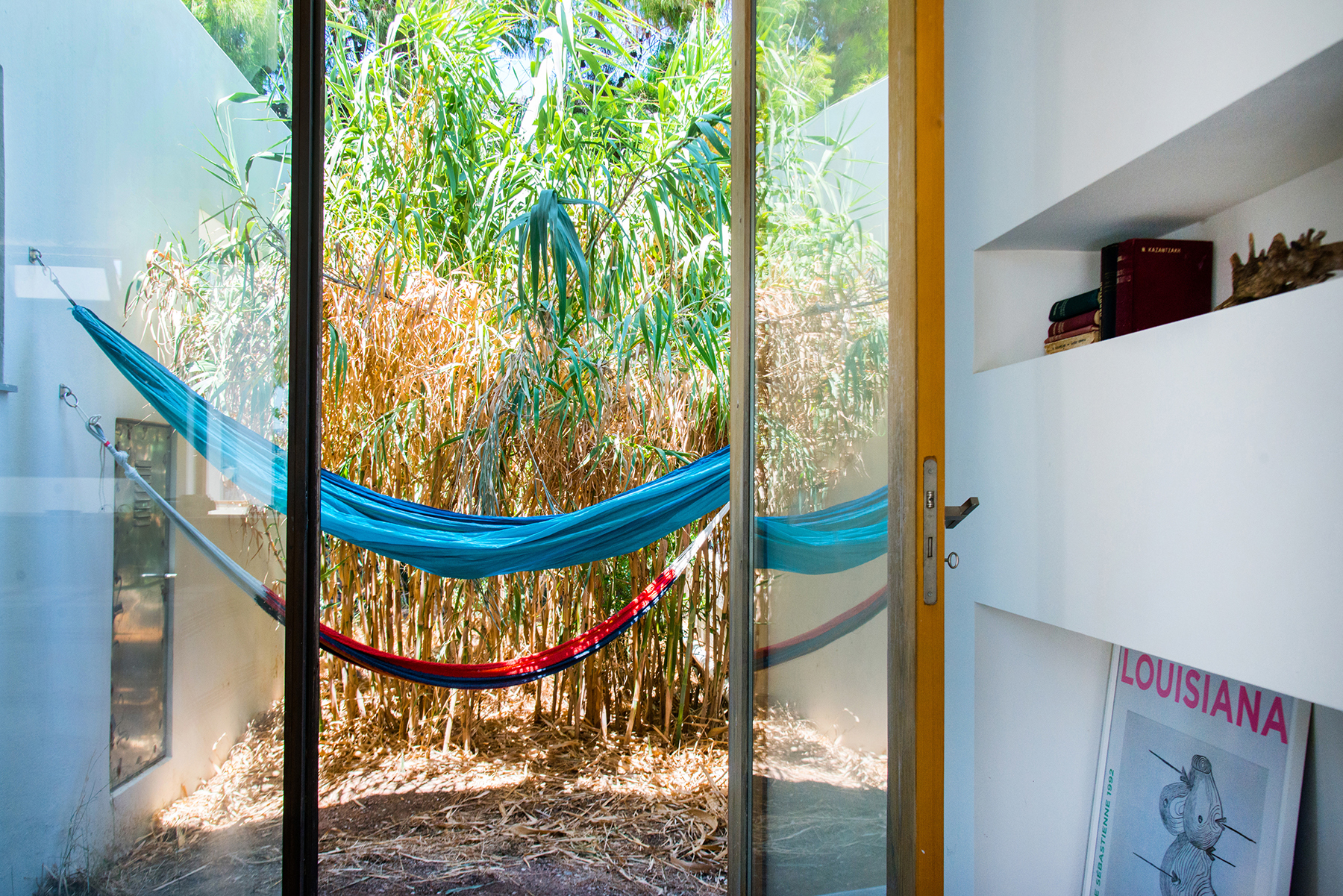 The materials—plaster, concrete, timber, and ceramic—are used in their natural state, without decoration or disguise. Within this simplicity, every junction and surface has been carefully composed, revealing a quiet depth of expression. The richness of the space emerges through texture, tone, and the subtle presence of things. Art appears not as display, but as gesture. Small interventions—improvised, tactile, intimate—reflect a creative life lived attentively, day by day. The plaster walls are smooth, thick, and whitewashed, creating a calm backdrop for everyday life. Niches are carved directly into the walls, becoming places for everyday objects and pieces of art—books, driftwood, ceramics. The built-in elements—bed bases, benches, and shelving—emerge seamlessly from the architecture, blurring the boundaries between structure, furniture, and sculpture. Nothing feels staged; everything appears quietly embedded in the life of the space.