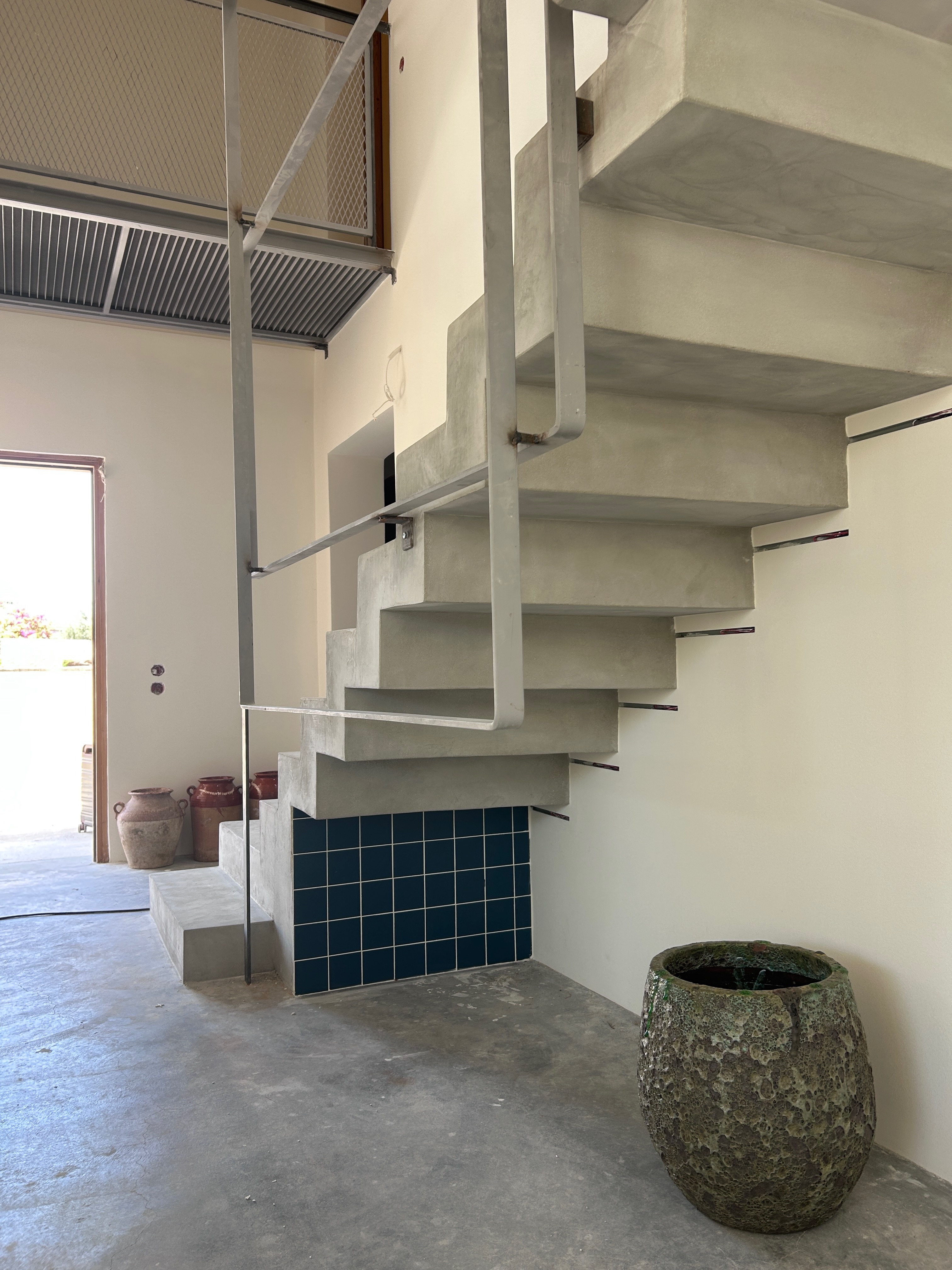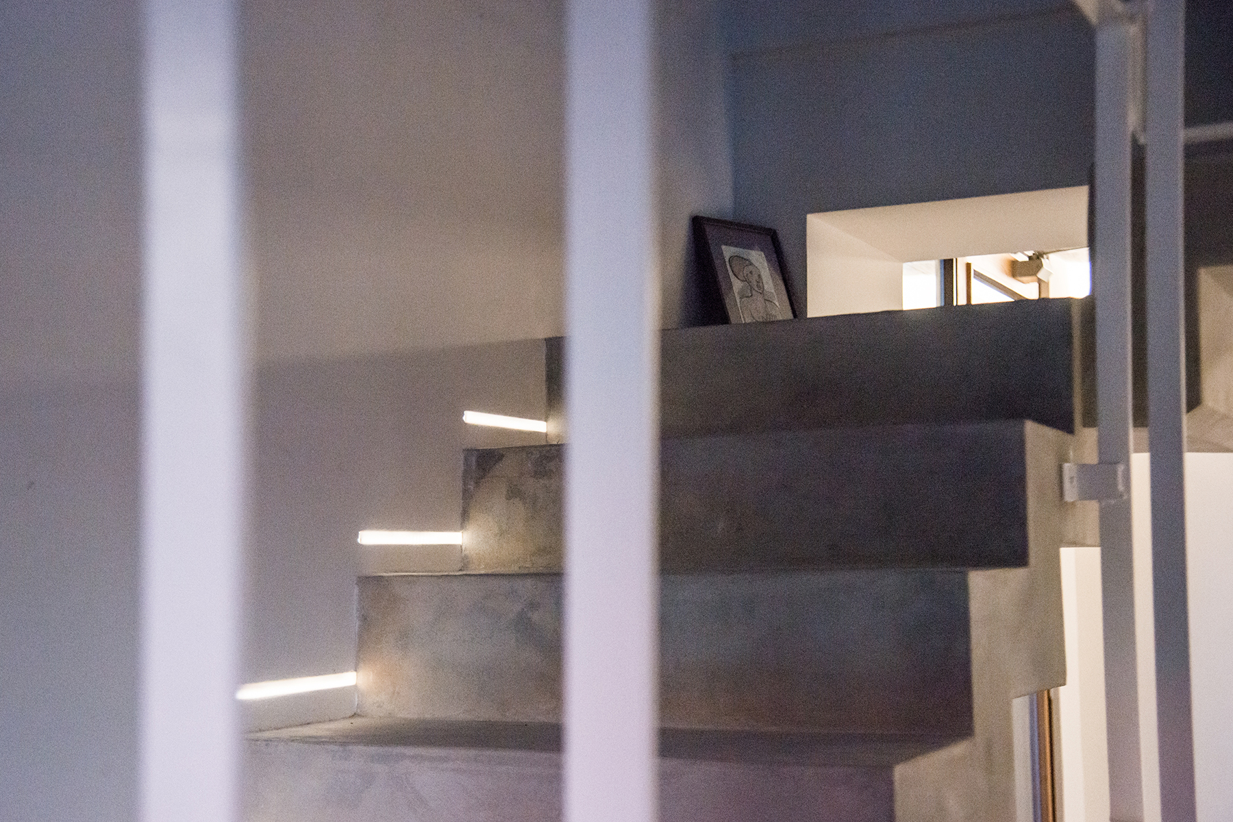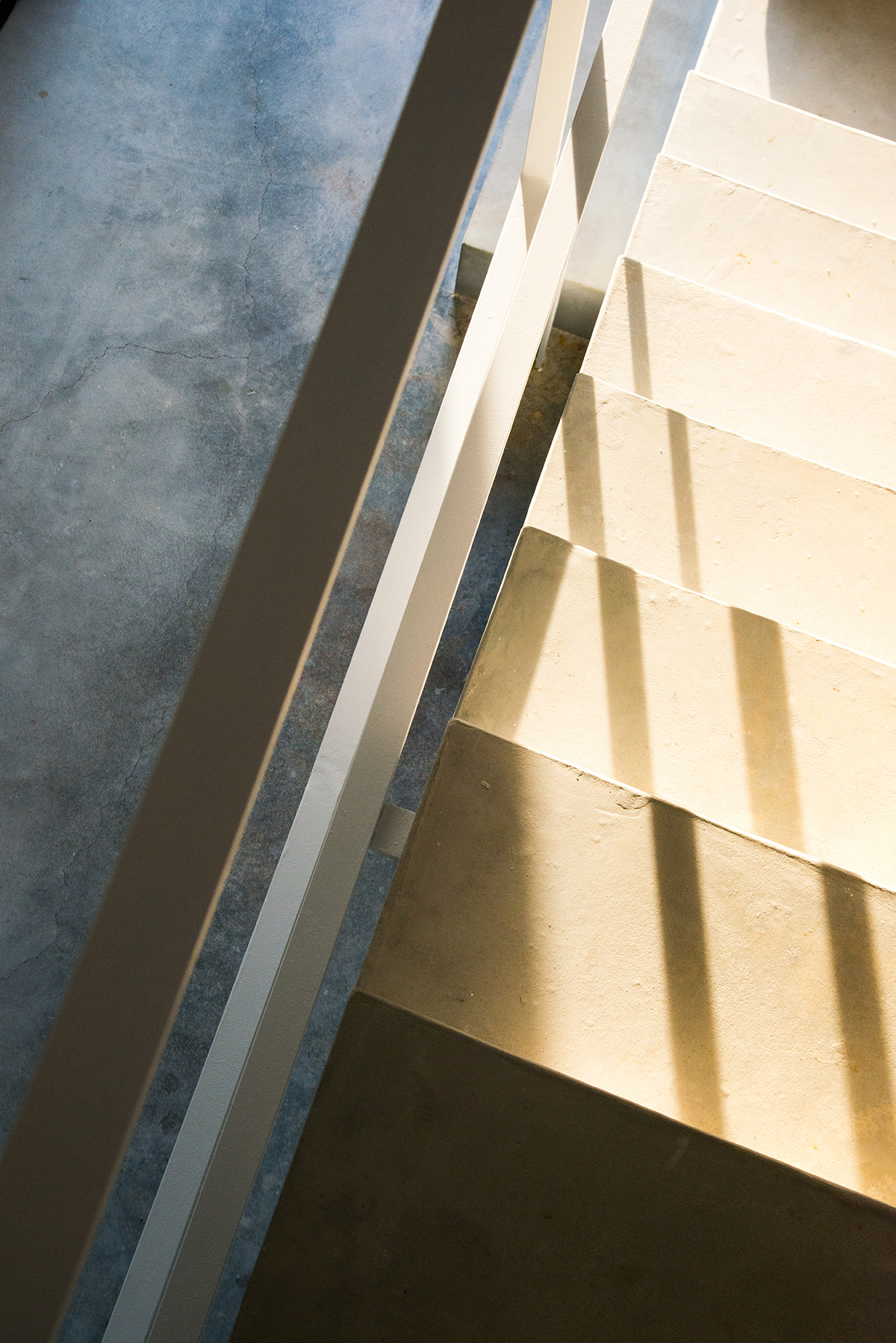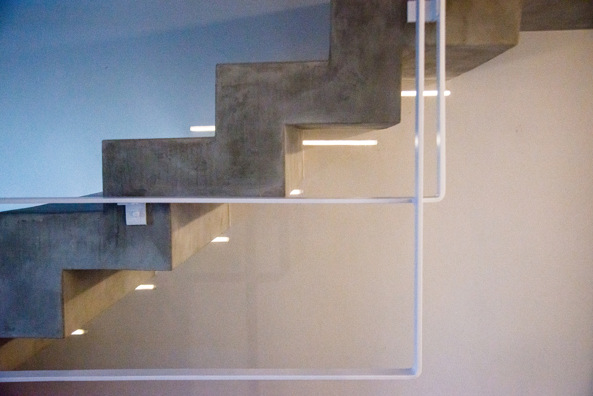 The sharp geometry of the cast-in-place exterior stairs is softened by light and shadow. The interior floating stair hovers with precision. The metal railing is sculptural and finely detailed. Its steel fixings exposed, becoming part of the aesthetic language.