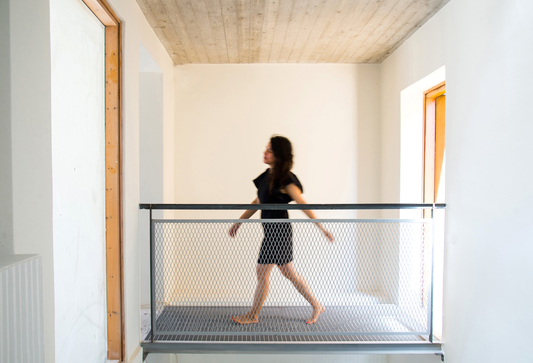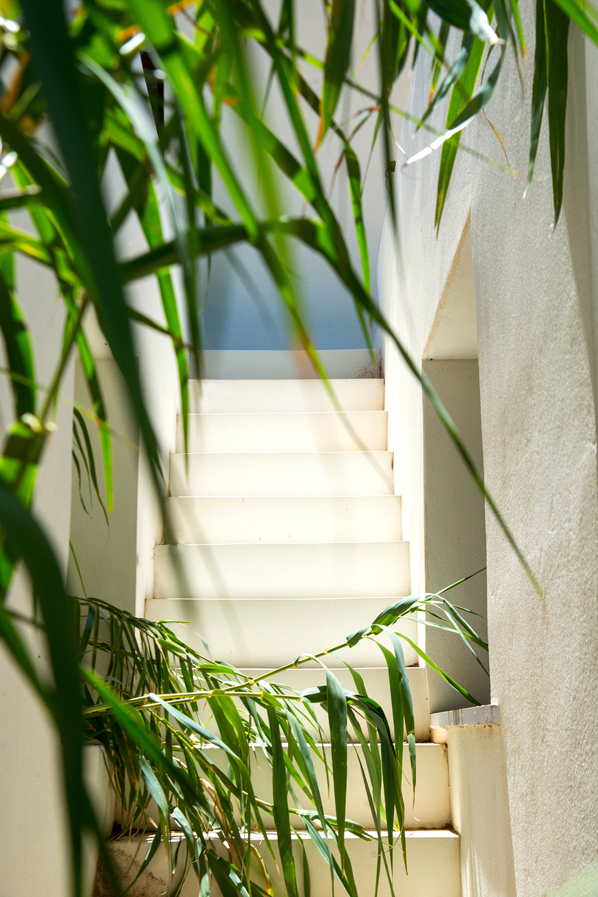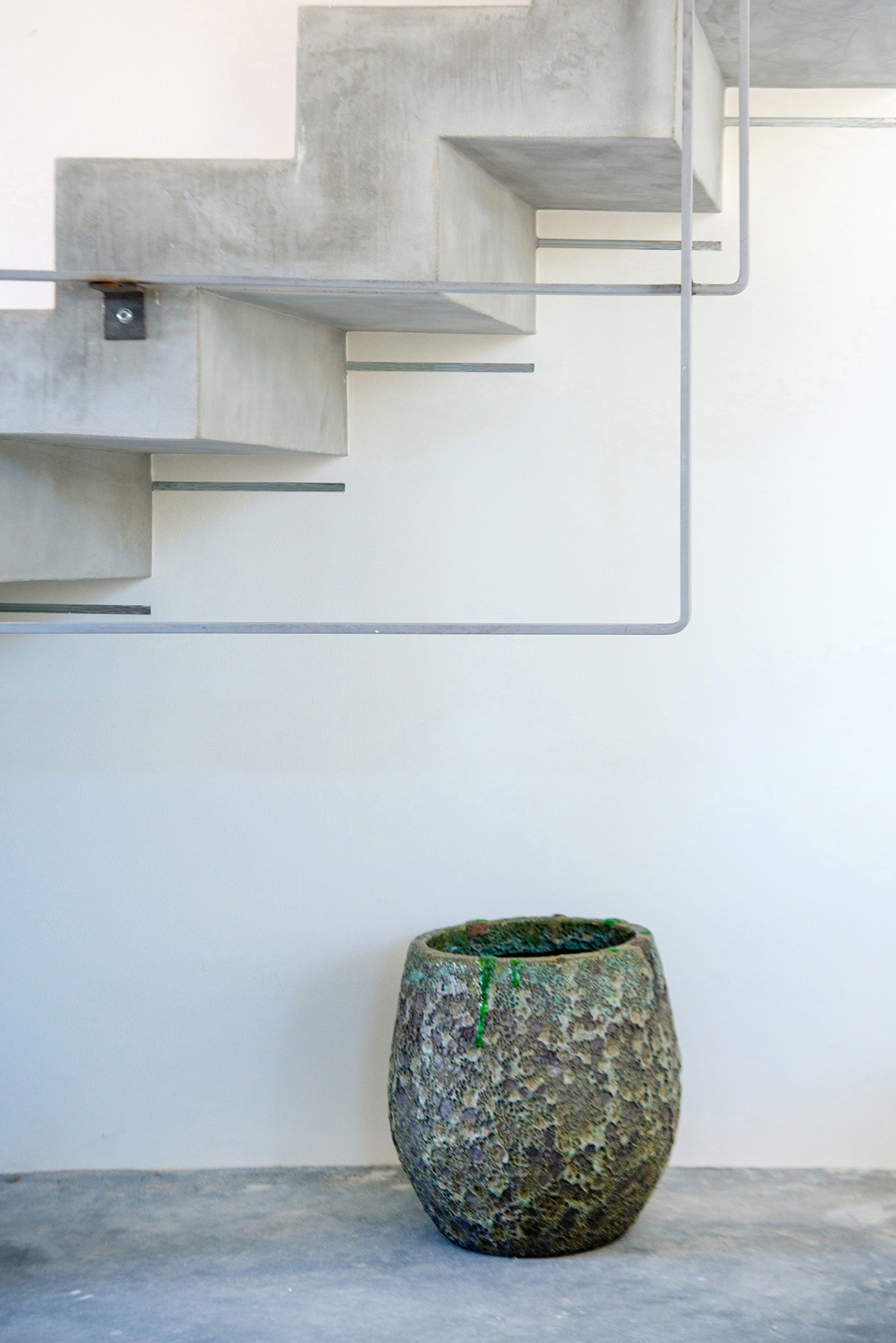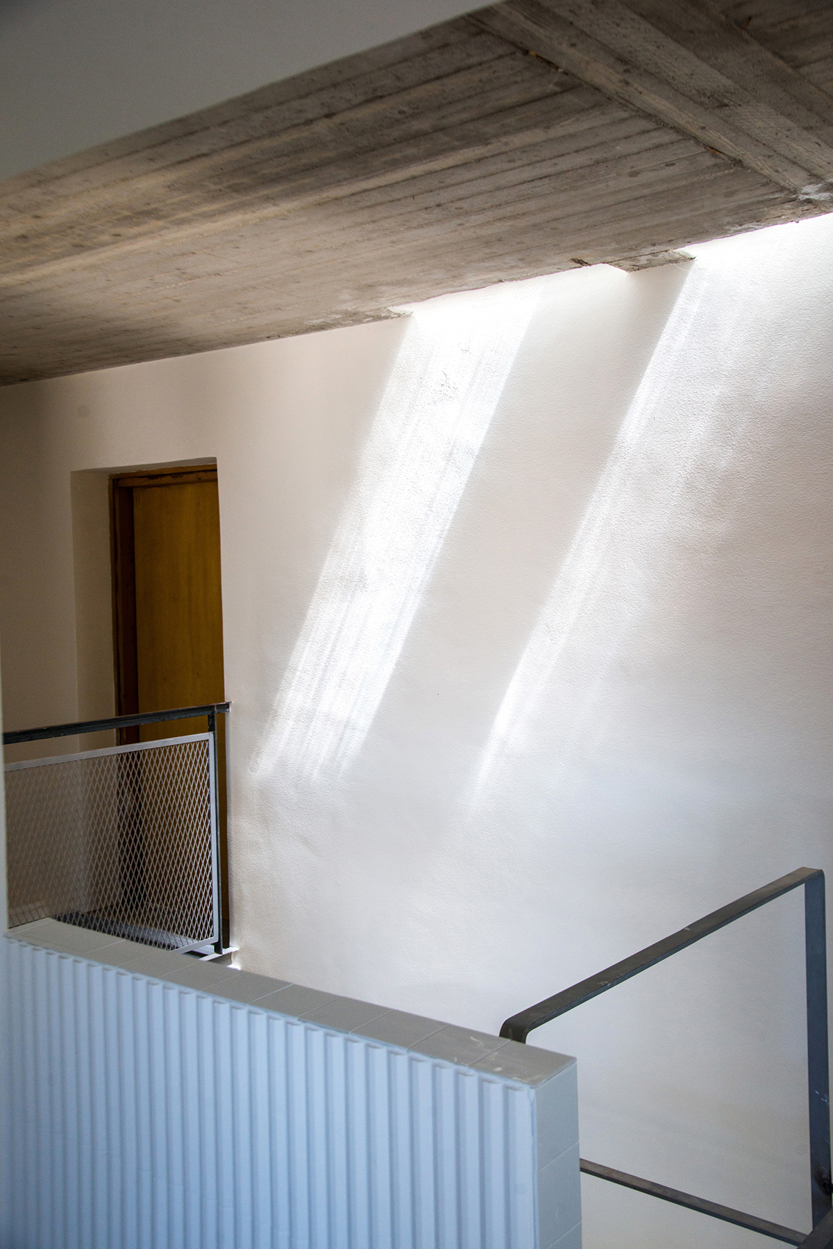 The sharp geometry of the cast-in-place exterior stairs is softened by light and shadow. The interior floating stair hovers with precision. The metal railing is sculptural and finely detailed. Its steel fixings exposed, becoming part of the aesthetic language.
