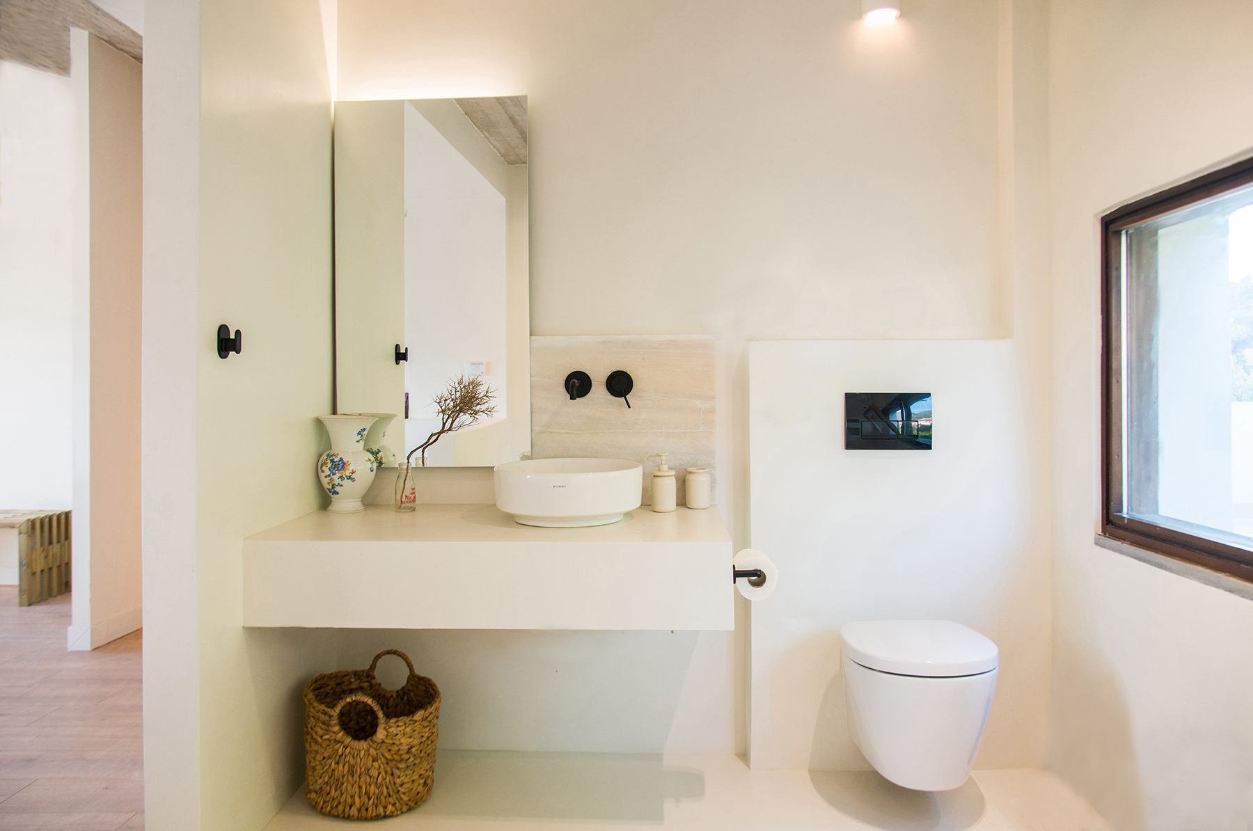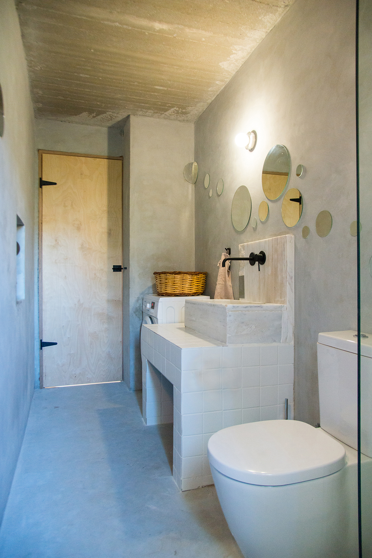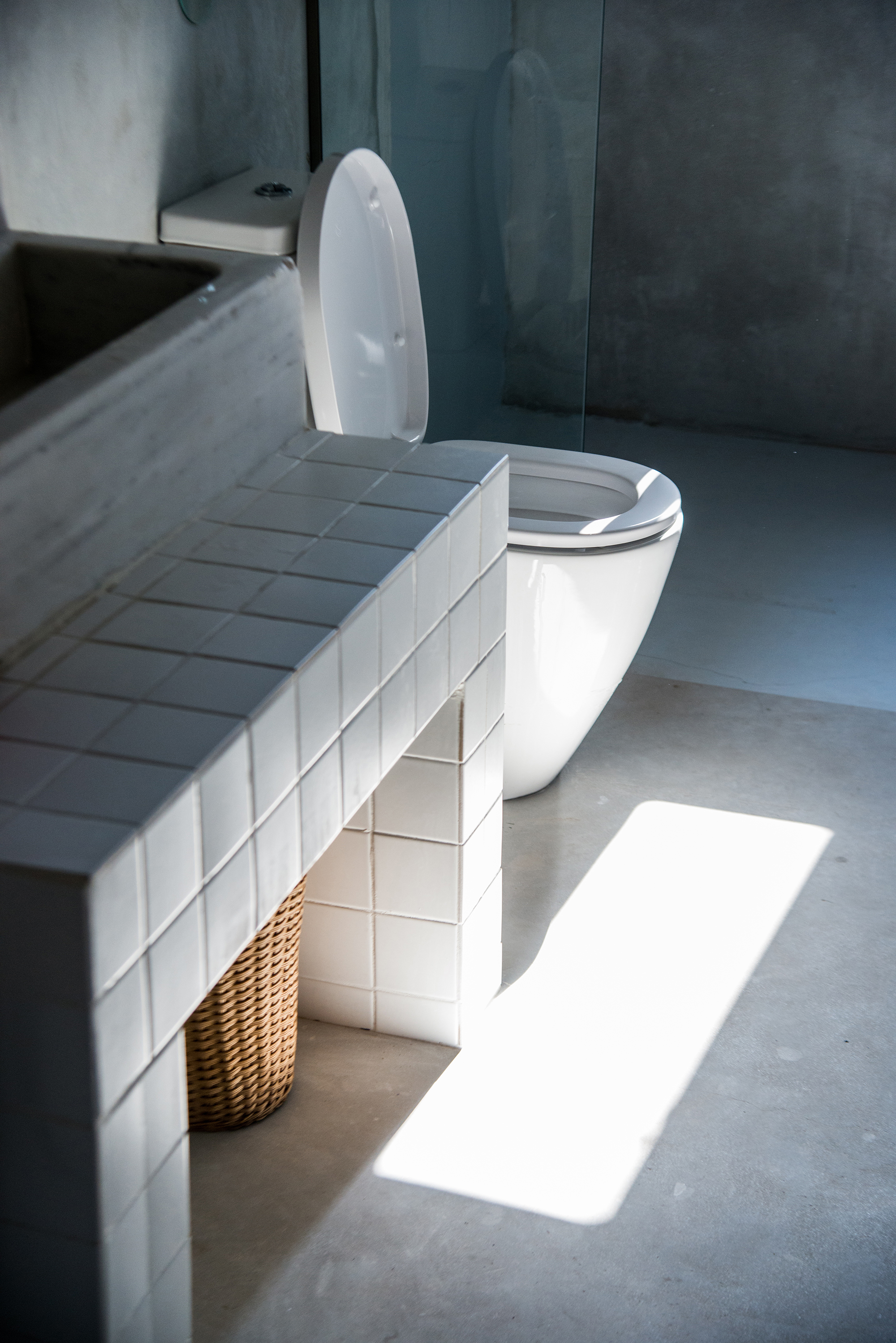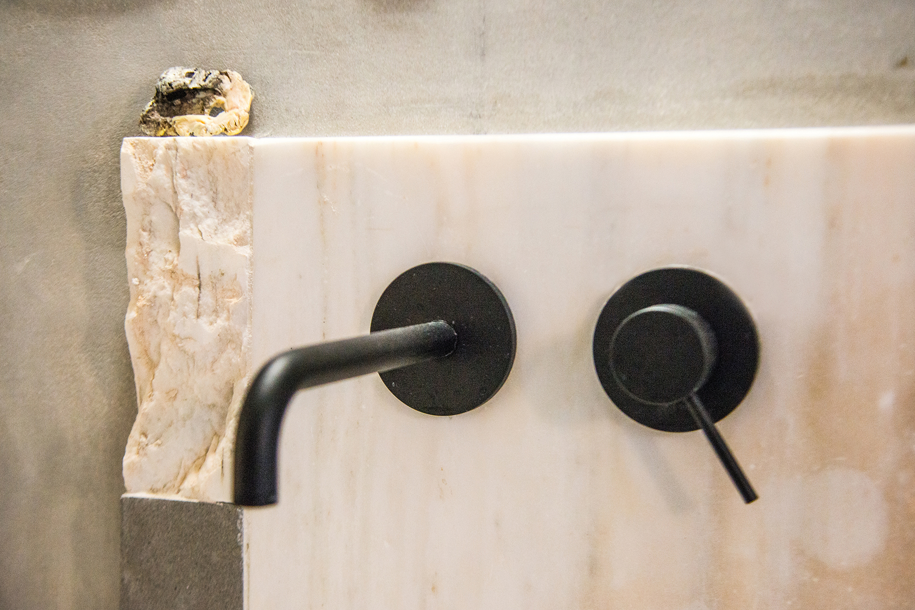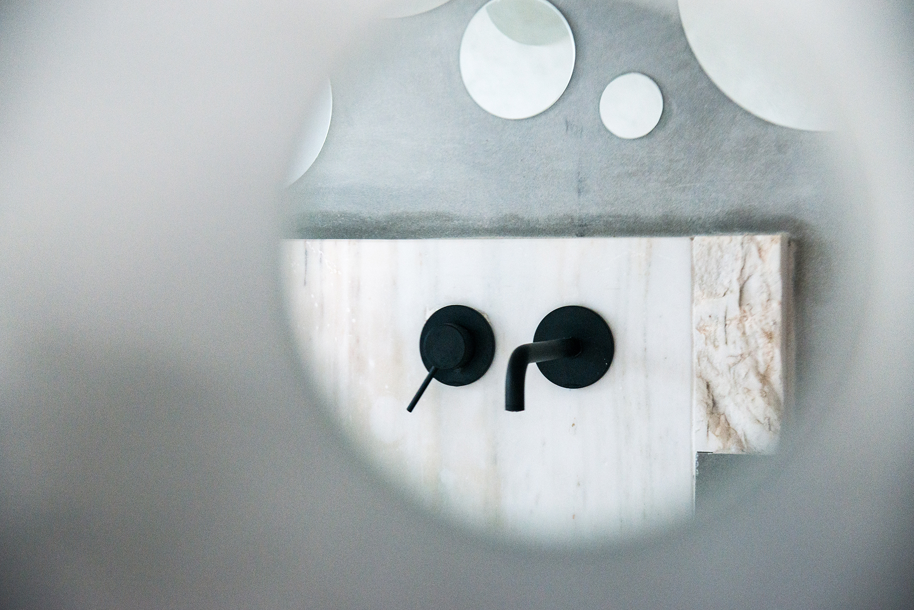 In the bathrooms, materials are treated like objects of care. Single marble slabs meet τhe tactile cement render and they both invite touch, catching the light in subtle gradations.