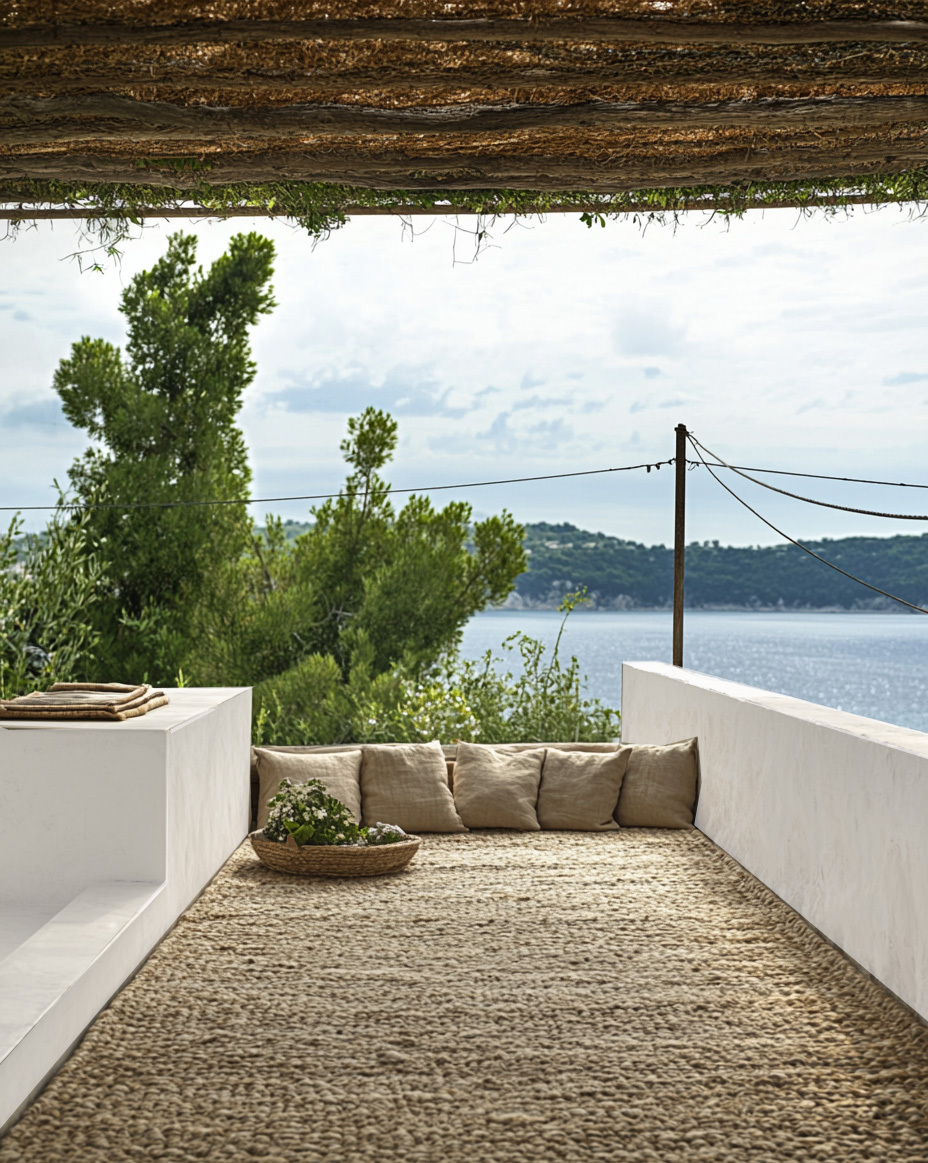 The landscape enters each room slowly—through glimpses, reflections, shifting shadows, or a passing breeze. The materials, like the architecture itself, reveal their character gradually, rewarding stillness and close observation.